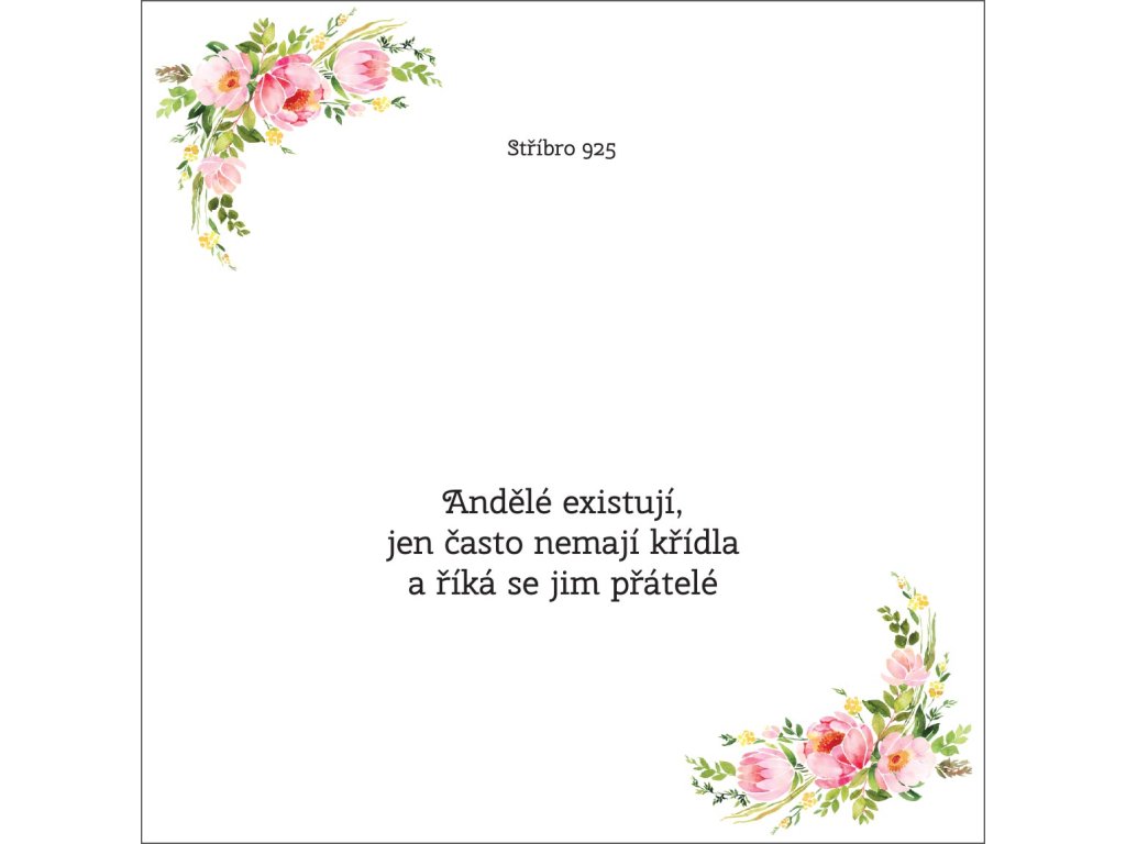 Vybrali jsme pro vás limitovanou edici dárkově zabalených šperků v obláčkové obálce jako z nebe snesené. Nemusíte již nic vymýšlet. Šperk i kartička s přáním jsou tematicky sladěné a připravené ihned k předání.Dárkový set obsahuje stříbrný náhrdelník anděl držící srdíčko ze zirkonu. Je zavěšený na dárkové kartě s nádherným přáním „Andělé existují, jen často nemají křídla a říká se jim přátelé“. Krásný něžný dárek pro kamarádku, která je vaším strážným andělem.