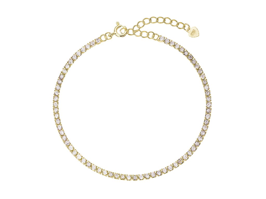 Elegantní tenisový náramek z pozlaceného stříbra, osazený řadou precizně broušených zirkonů, které krásně odrážejí světlo při každém pohybu. Jeho jemný, ale výrazný design z něj dělá luxusní doplněk pro každou příležitost – od běžného nošení až po slavnostní večery. Díky nastavitelné délce perfektně padne na každé zápěstí. Třpytivé zirkony o velikosti 2 mm jsou vsazené do zlaceného stříbra ryzosti 925/1000.