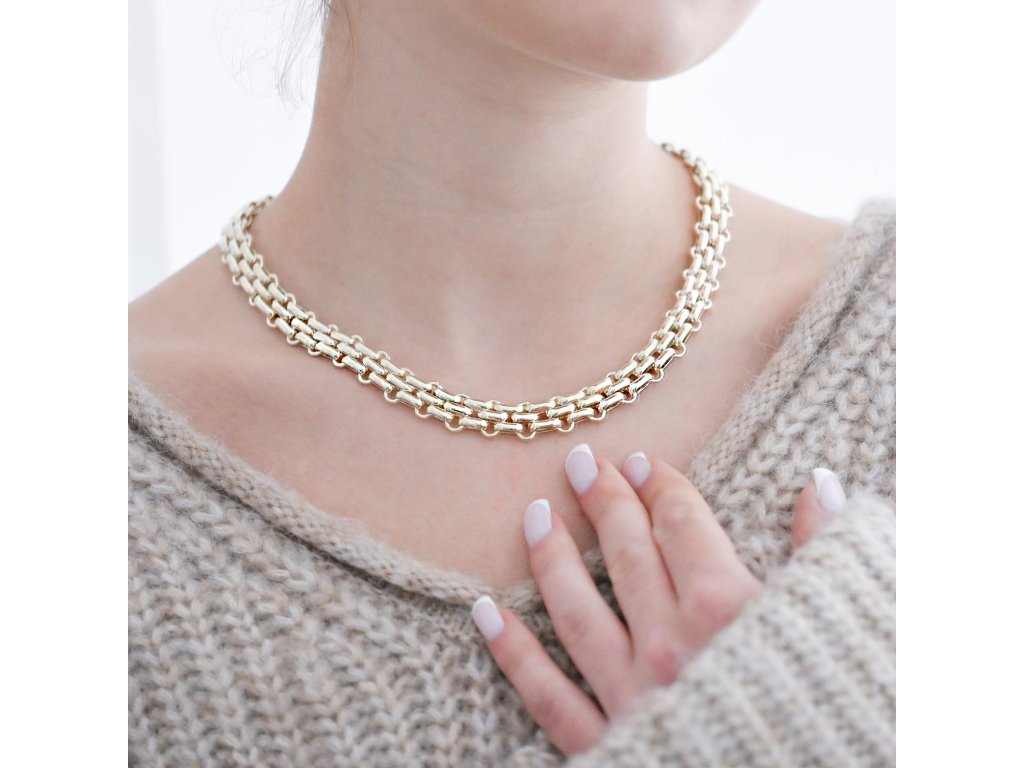 Elegantní náhrdelník z kvalitního stříbra je potažen vrstvou zlata, která mu dodává luxusní vzhled. Díky propracovanému článkovému designu působí masivně a přitom si zachovává jemnost a sofistikovanost. Délka 45 nebo 46 cm zajišťuje ideální padnutí ke krku a perfektní doplnění jakéhokoli outfitu – od každodenní elegance po slavnostní příležitosti.
