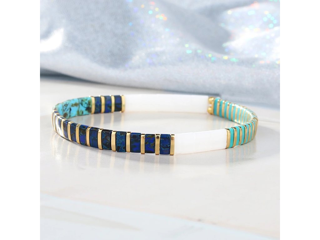 Oživte svůj outfit tímto sofistikovaným Miyuki Tila náramkem. Precizně seřazené modré a bílé korálky vytvářejí čistý a svěží design. Lehký a pohodlný na nošení, perfektní pro každou příležitost.