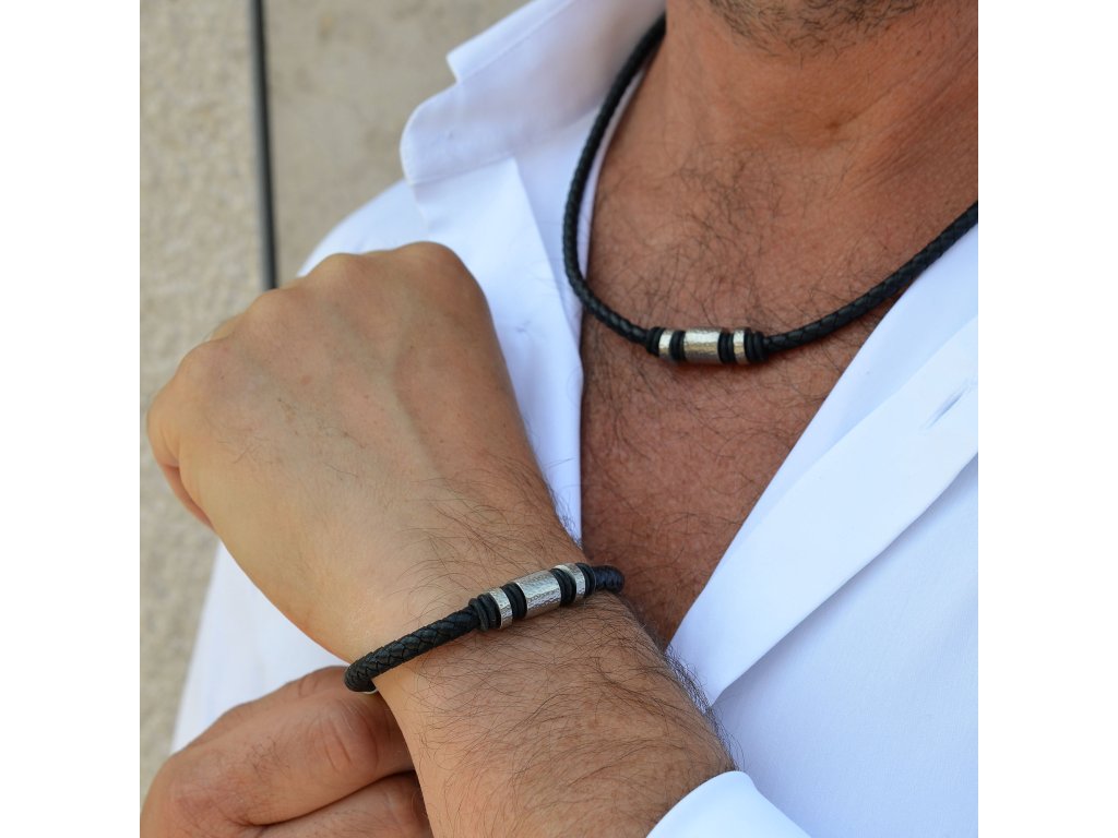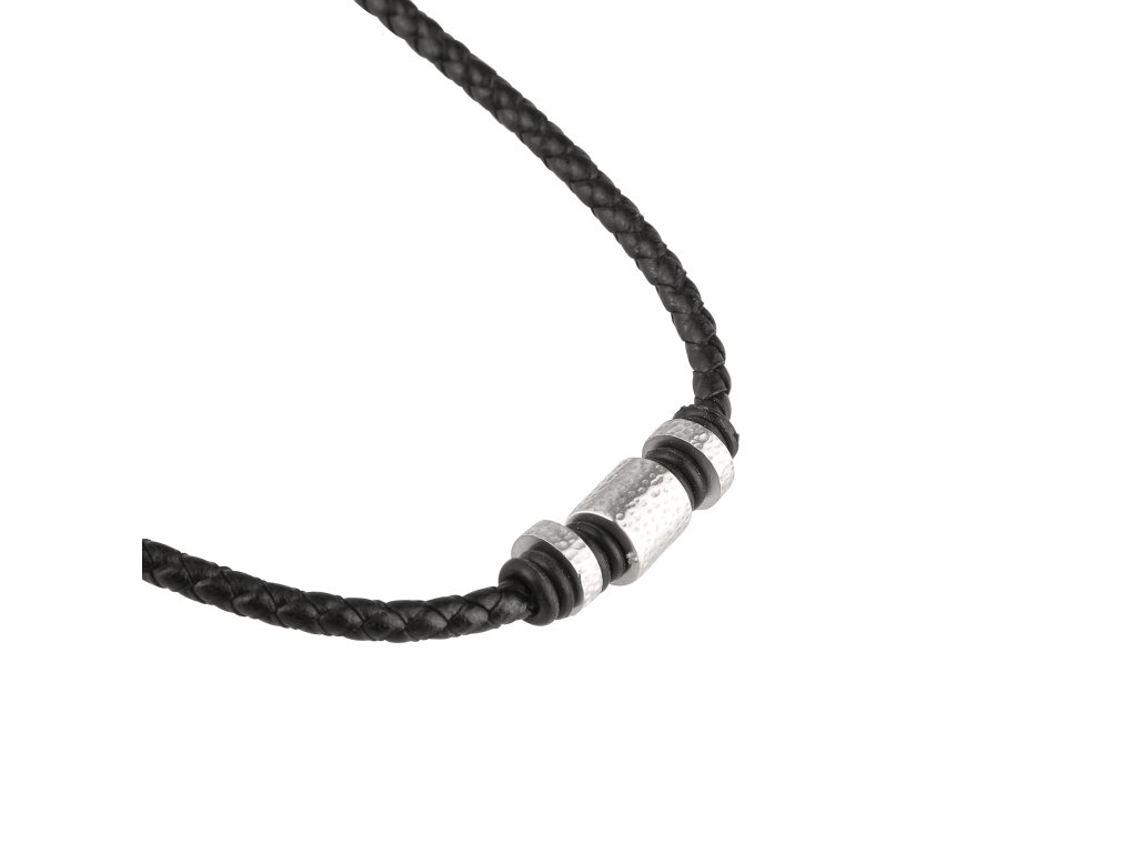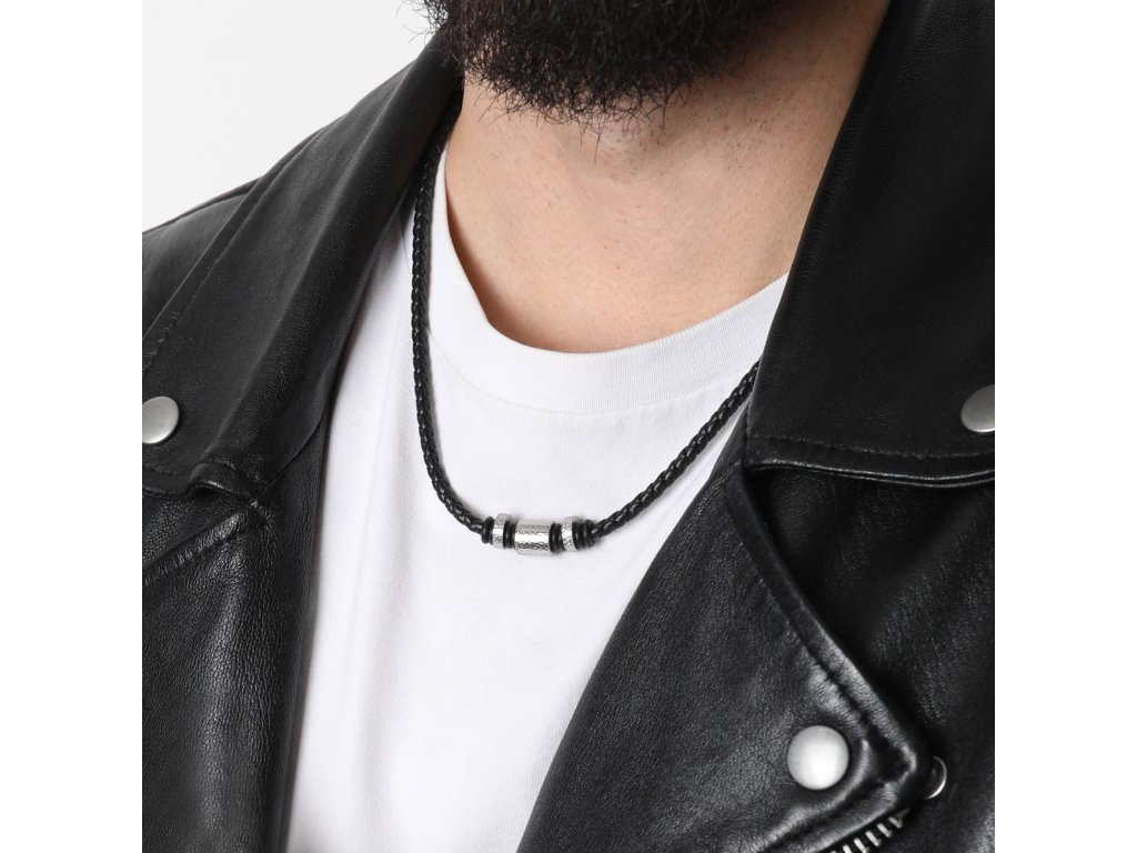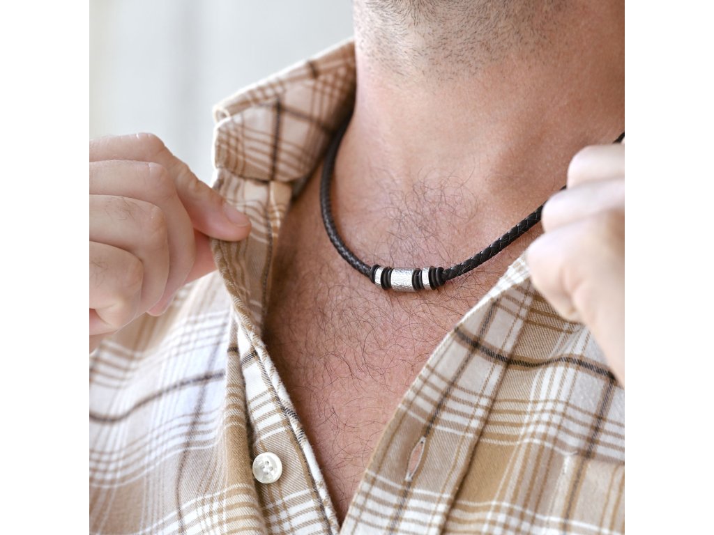 Elegantní pánský náhrdelník vyrobený z černé recyklované kůže, pečlivě zapletené do stylového designu. Náhrdelník je doplněn ozdobnými kovovými prvky, které dodávají moderní a sofistikovaný vzhled. Díky nastavitelné délce 50+5 cm perfektně sedí a zajišťuje pohodlné nošení. Ideální doplněk pro muže, kteří ocení styl, udržitelnost a precizní zpracování.