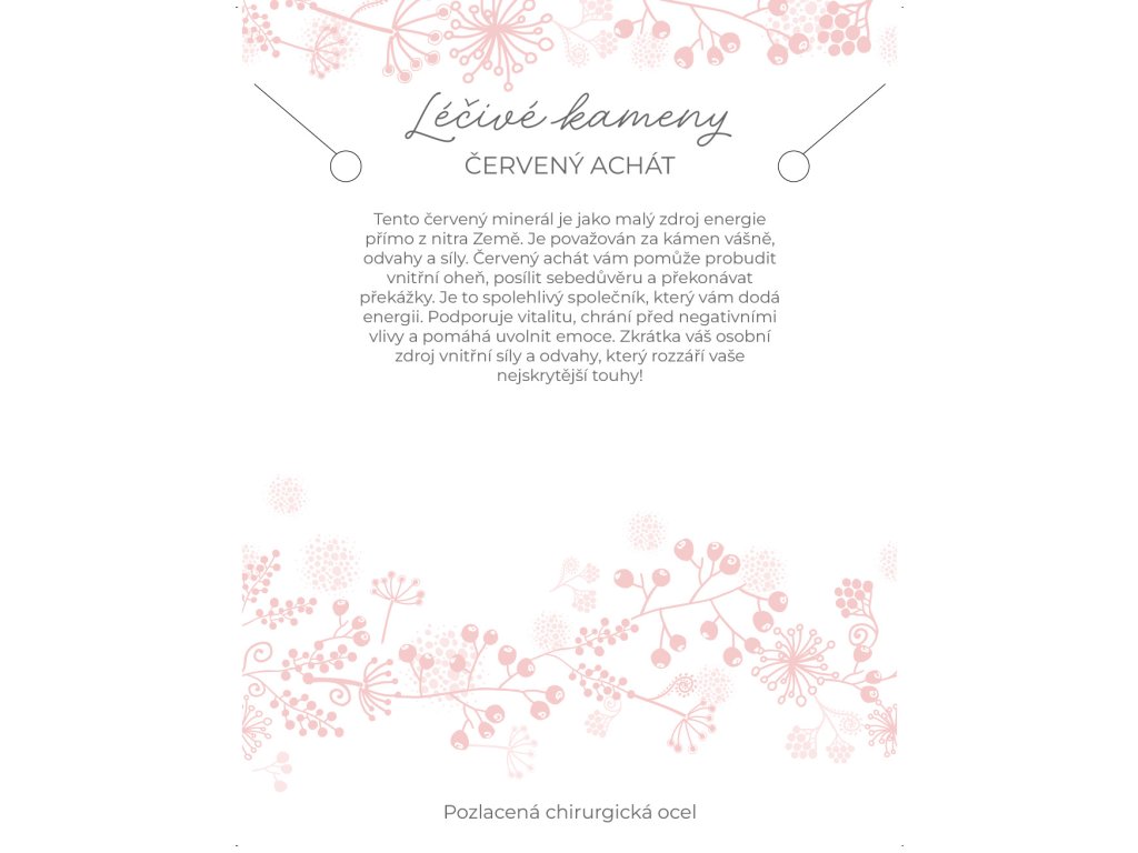 Achát vyniká svou růžovo-červenou barvou, která přitahuje pozornost a dodává šmrnc. Nepravidelné tvary kamenů vytvářejí originální a přirozený vzhled.