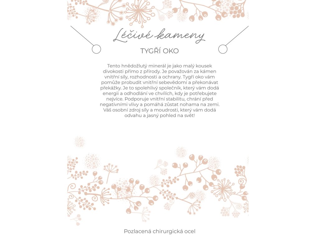 Ocelový náhrdelník s tygřím okem nabízí jedinečný design díky nepravidelným tvarům kamenů. Každý kámen je pečlivě vybrán a uspořádán dle velikosti, což zajišťuje harmonický vzhled.