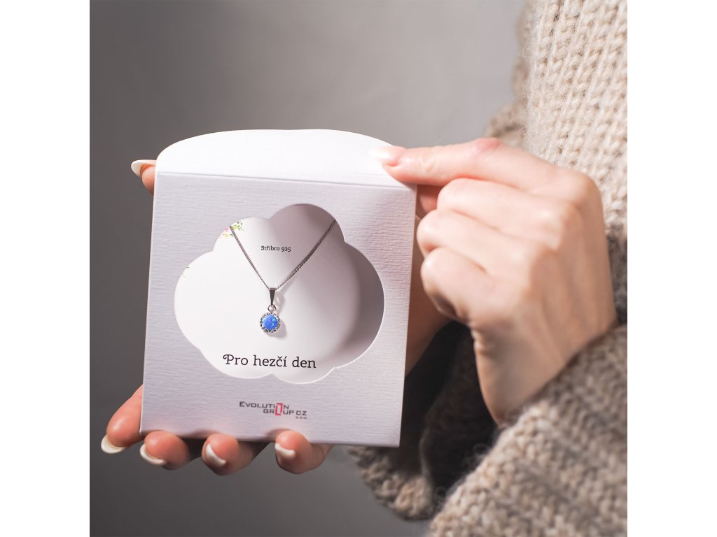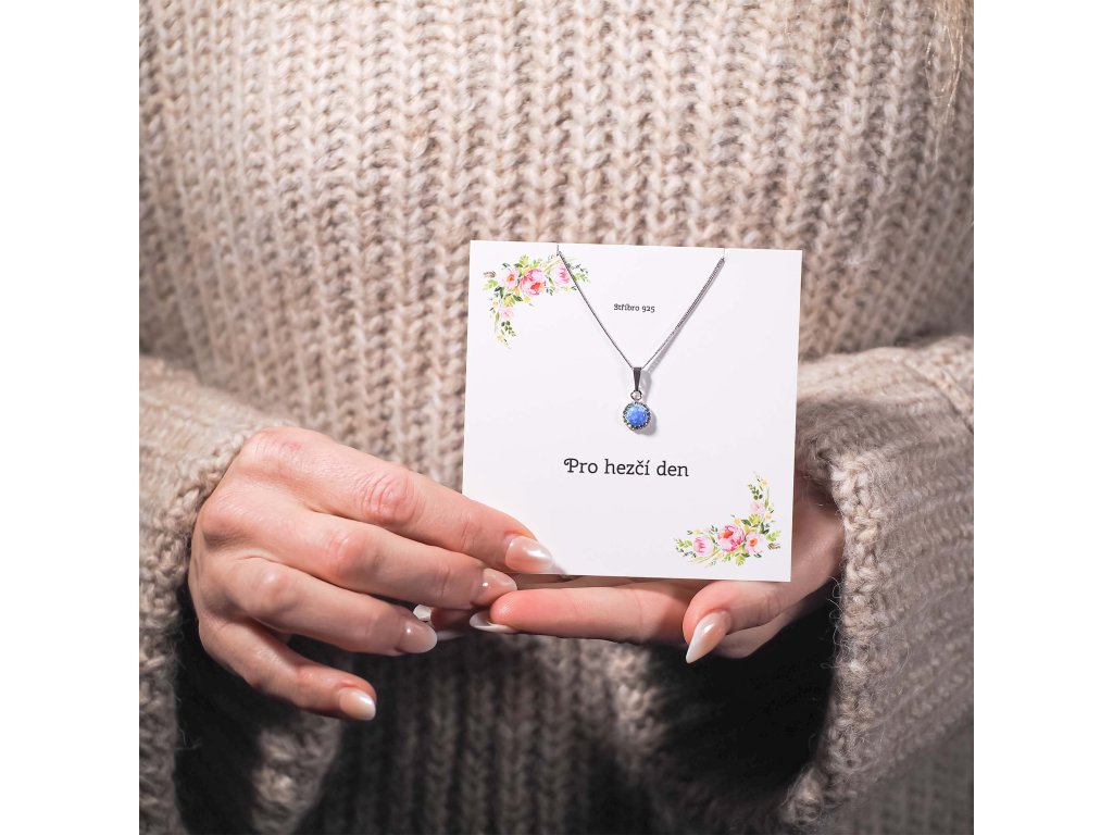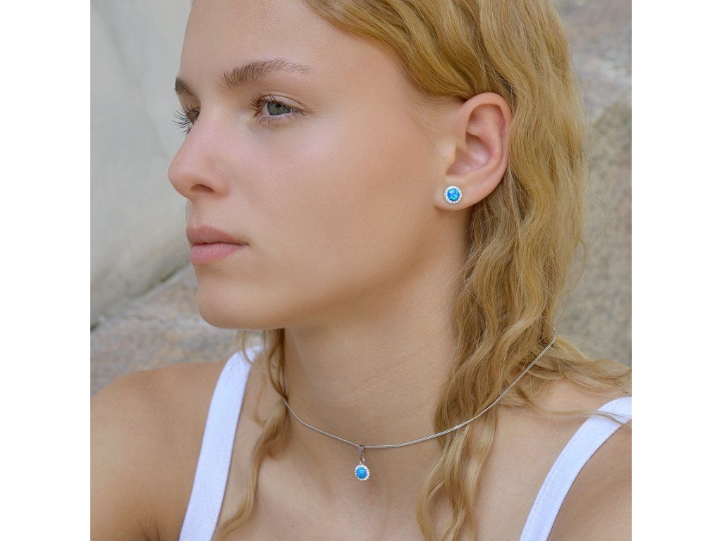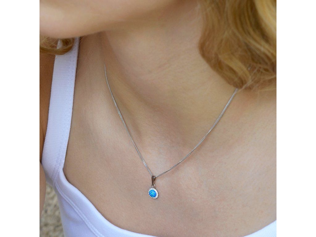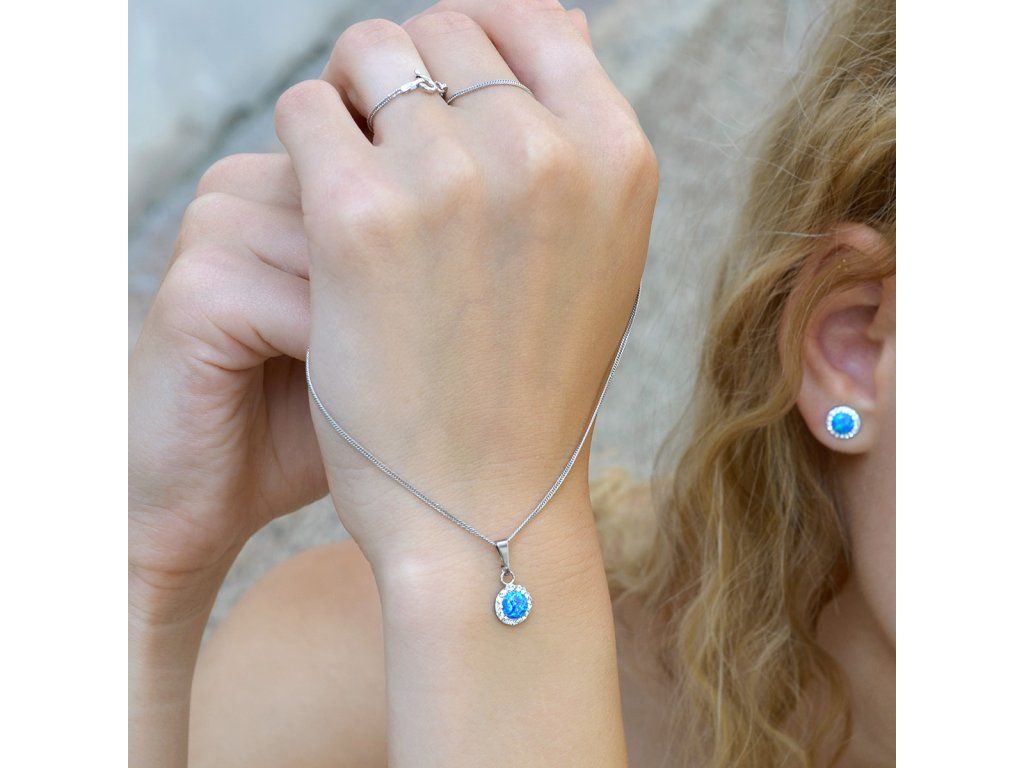Náhrdelník obsahuje řetízek s kulatým přívěskem. Šperk je vyrobený ze stříbra ryzosti 925/1000, které prošlo povrchovou úpravou rhodiem. Rhodium chrání šperk proti zčernání, zežloutnutí i poškrábání. Přívěšek je zdobený modrým syntetickým opálem, který je navíc olemován malými třpytivými Preciosa krystaly v bílé barvě. Můžete si k němu vybrat i stejné náušnice se zapínáním na puzetu nebo šroubek. Jelikož šperk neobsahuje žádný přídavek niklu, mohou ho bez obav nosit i alergici.