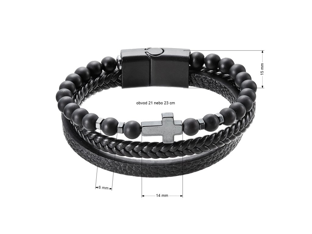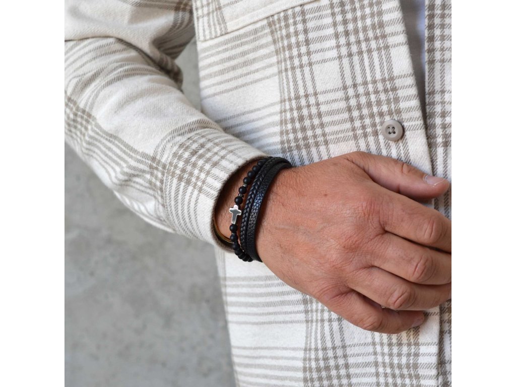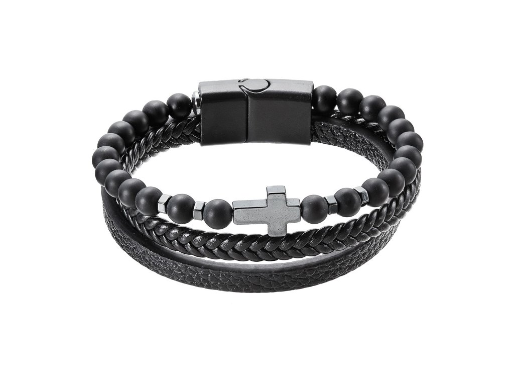 Tento elegantní náramek kombinuje koženku a matné černé korálky, což vytváří stylový doplněk pro každého muže. Černá barva a hematitový kříž dodávají náramku nadčasový vzhled.