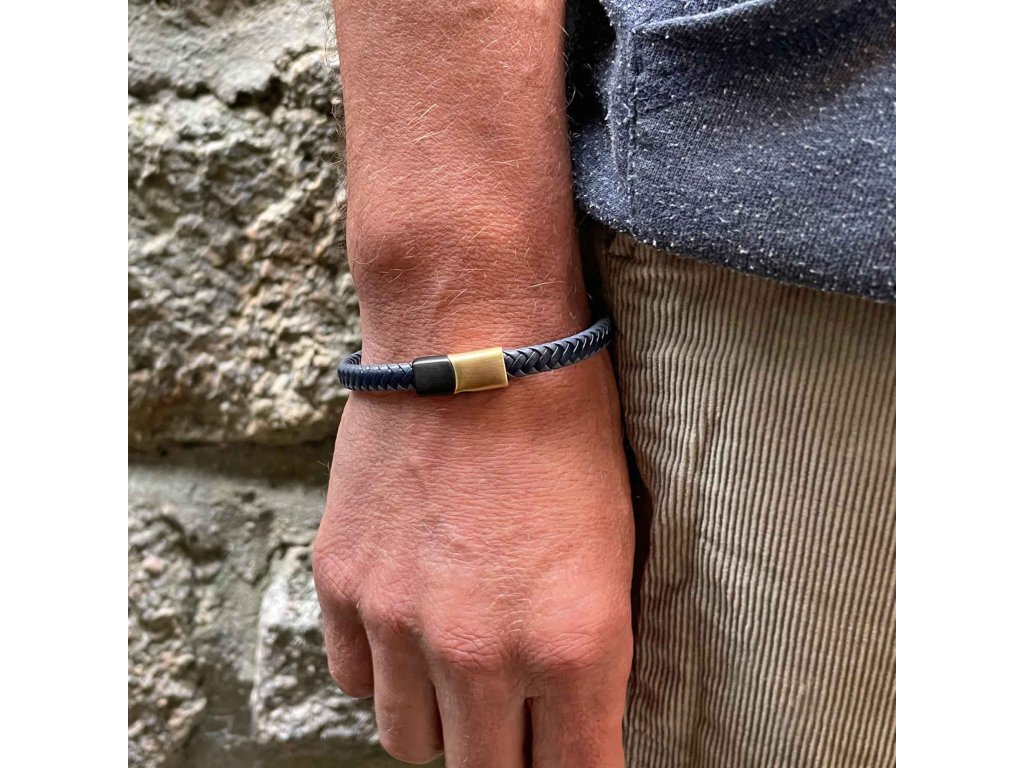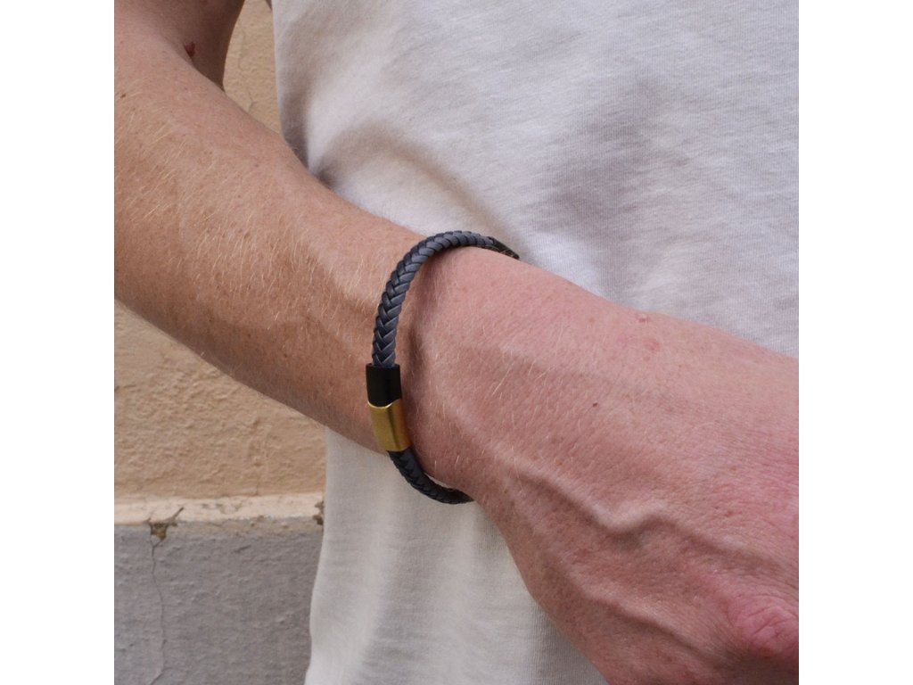 Moderní pánský náramek pro muže! Kombinace modrošedé a zlaté je velmi atraktivní. Náramek je vhodným dárkem pro elegantní muže. Náramek je tvořen jedním zapleteným páskem z recyklované kůže modrošedé barvy a zdobí jej prvky ve zlaté a černé barvě.Zapínání je ozdobné a magnetické ve zlato černé kombinaci. Délka náramku je 21 cm. Šperk neobsahuje nikl, a tak se nemusíte obávat žádné alergické reakce.