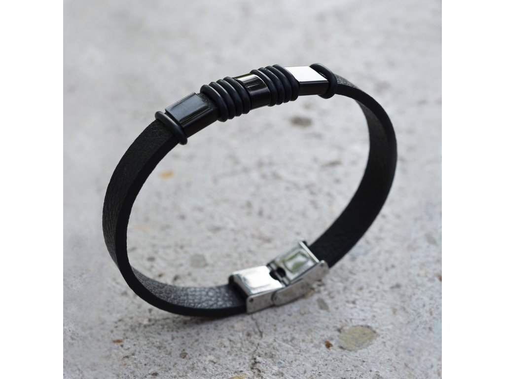 Zajímavý pánský náramek pro moderní muže! Podtrhněte svůj vzhled originálním pánským náramkem. Náramek je vyrobený z černé koženky, má tvarované prvky černé barvy a vkusně doplní Váš outfit.Zapínání je ocelové stříbrné barvy. Délka náramku je 21 cm. Šperk neobsahuje nikl, a tak se nemusíte obávat žádné alergické reakce.