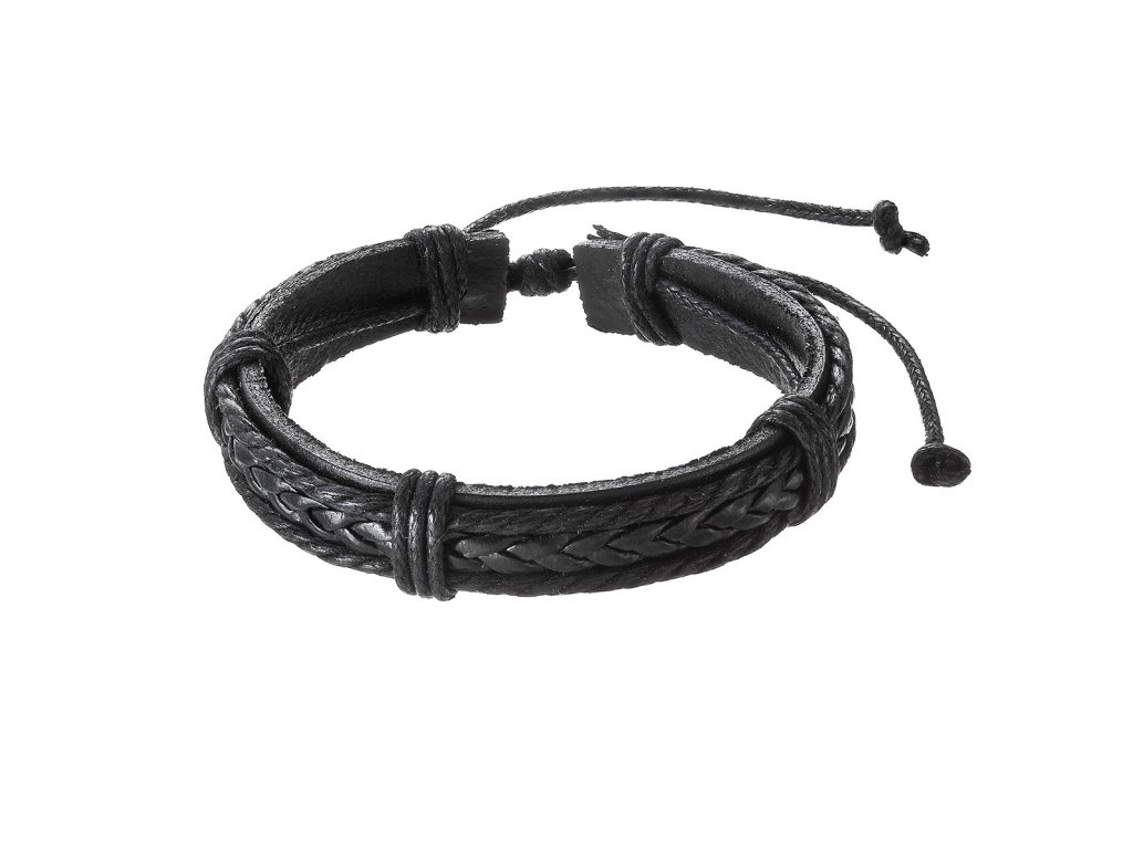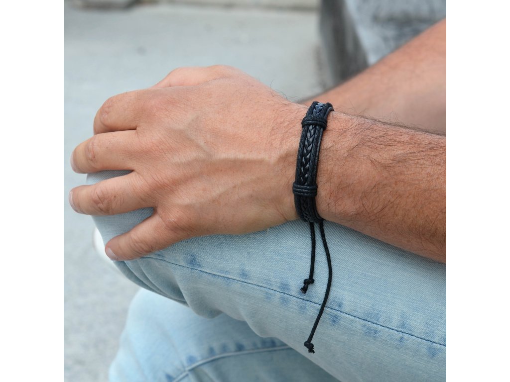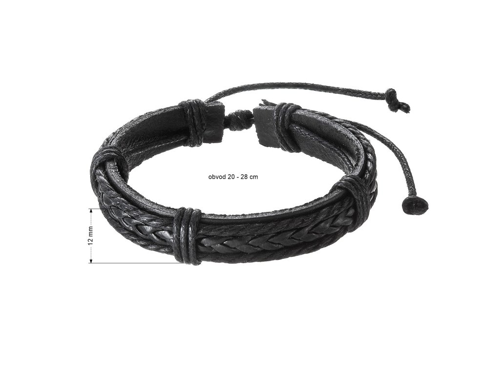 Náramek pánský z černé koženky muži zcela jistě ocení. Náramek je tvořen zapleteným páskem z koženky černé barvy a je zdobený zajímavými prvky. Náramek má univerzální nastavitelnou velikost díky lanku s voskovou úpravou. Délku náramku lze jednoduše měnit zatažením za konce šňůrky.Koženkový pánský náramek je vhodný pro neformální příležitosti.