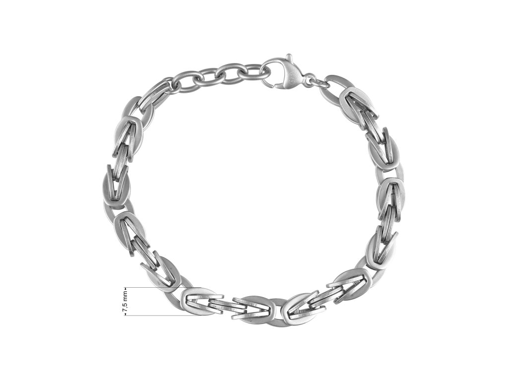 Masivní pánský náramek z pískované oceli, který zaujme svým robustním a moderním designem. Originální do sebe zapadající oka vytvářejí atraktivní texturu a zajišťují pevnost i pohodlí při nošení. Povrchová úprava pískováním dodává náramku matný a stylový vzhled, ideální pro muže, kteří hledají výrazný doplněk. Nastavitelná délka 21+3 cm umožňuje přizpůsobení pro perfektní padnutí. Skvělá volba pro milovníky kvalitních a elegantních šperků.