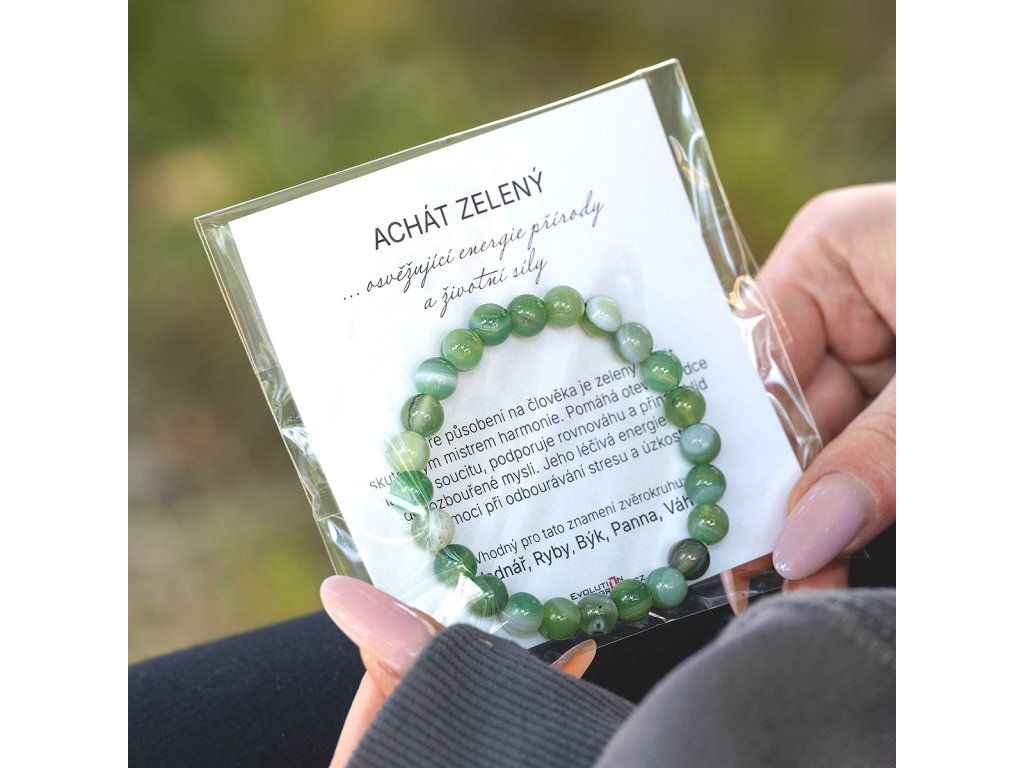 Zelený achát je považován za kámen obnovy, vnitřního klidu a propojení s přírodou. Pomáhá zklidnit mysl, harmonizovat tělo a duši, a podporuje regeneraci jak na fyzické, tak na emoční úrovni. Jeho jemná, uzemňující energie přináší pocit rovnováhy a bezpečí, zejména v období stresu a změn. Díky elastickému provedení se náramek snadno přizpůsobí většině velikostí zápěstí a pohodlně se nosí po celý den.