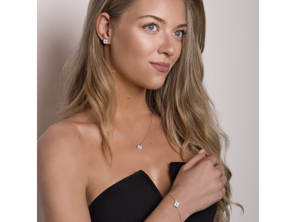 Čtyři syntetické opály jsou jedinečně stylizované do podoby čtyřlístku. Jejich bílá barva spolu s podmanivými odlesky v sobě nese poselství něžné ženskosti a pohádkového štěstí.