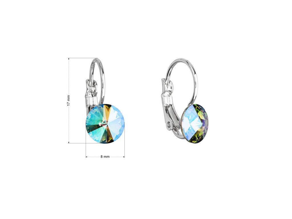 Náušnice mají délku 17 mm a zapínají se na klapku. Šperk je zdoben kulatým 8 mm širokým Swarovski krystalem v zeleno-fialové barvě.