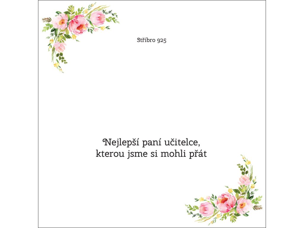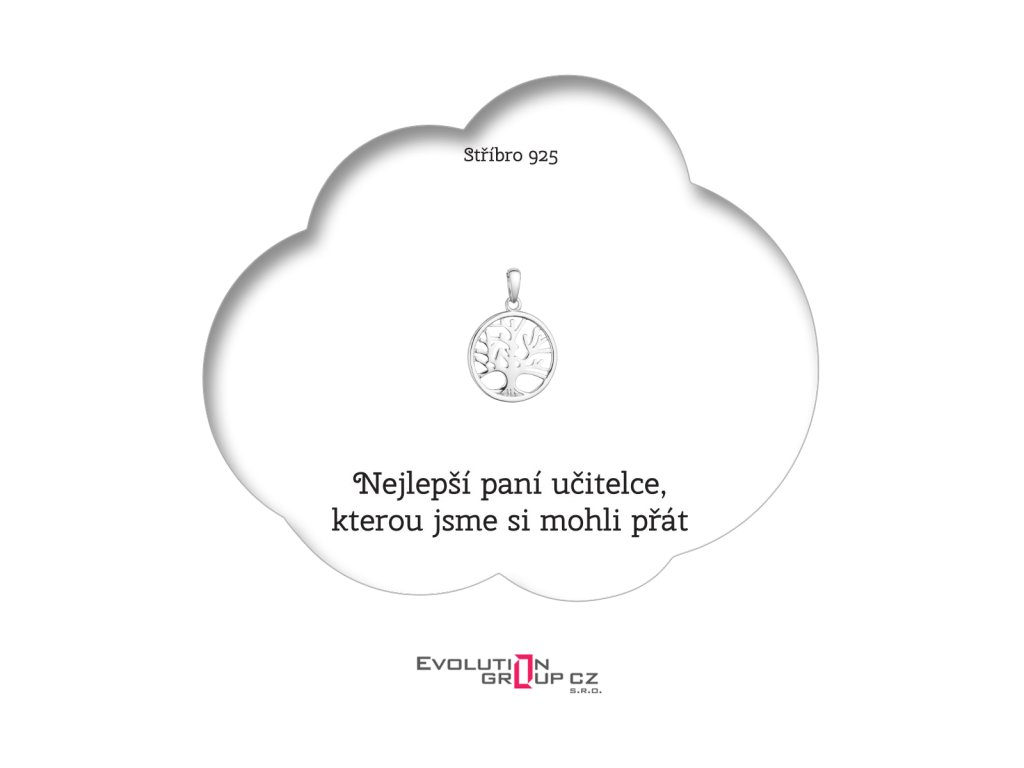 Dárkový set obsahuje stříbrný přívěsek strom života, který je zavěšený na dárkové kartě s nádherným přáním „Nejlepší paní učitelce, kterou jsme si mohli přát".