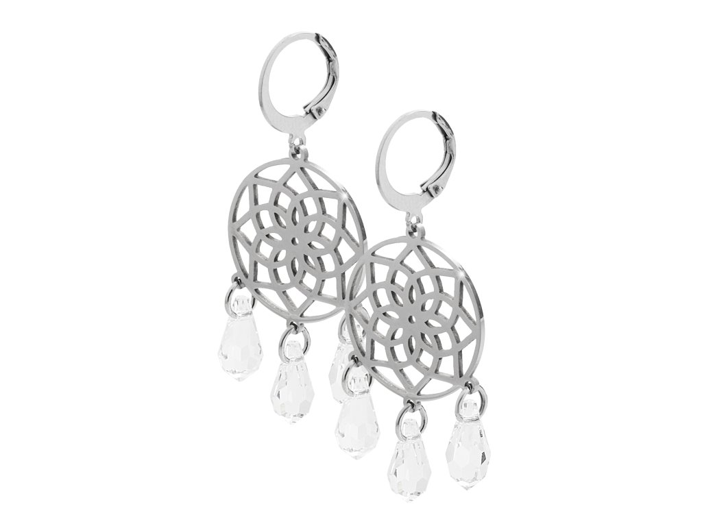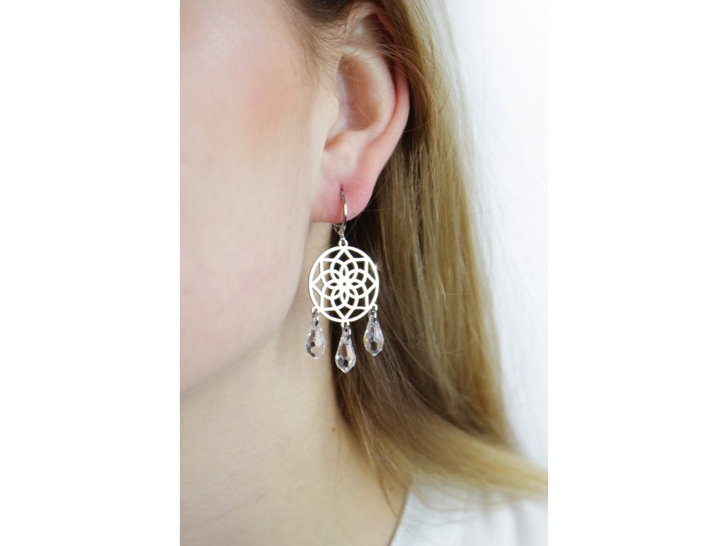 Ocelové náušnice klapky prořezávaný květ života s dropsy Swarovski Crystal