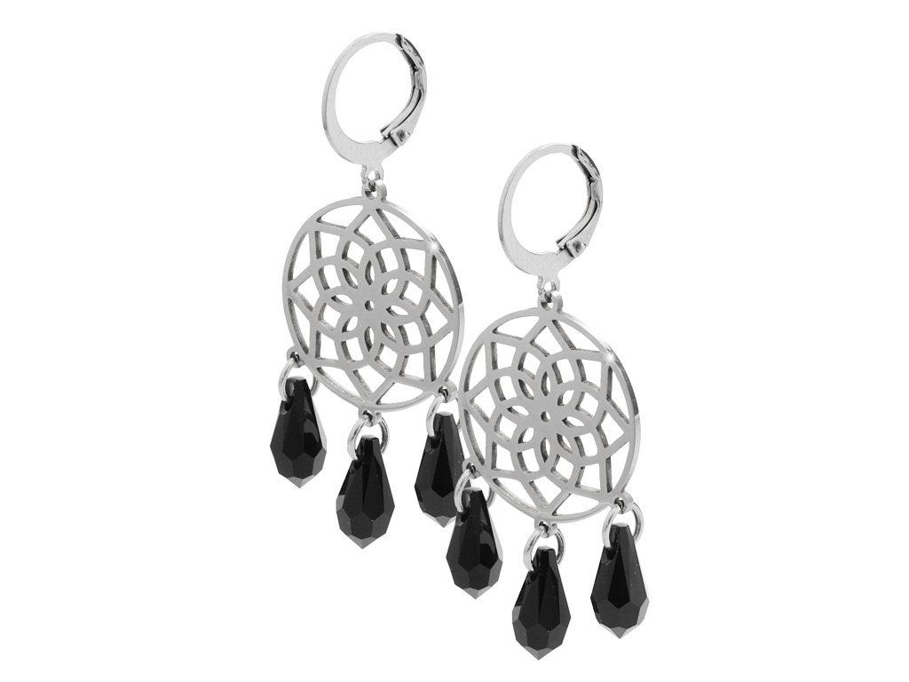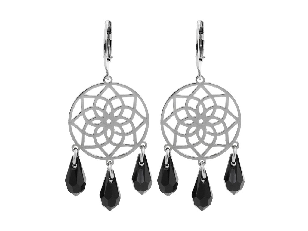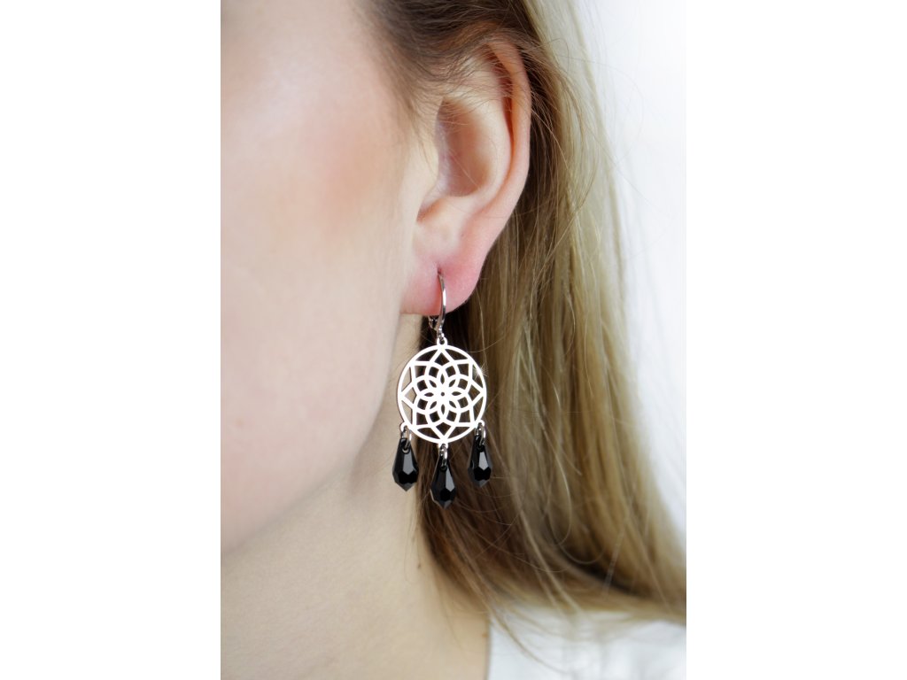Ocelové náušnice klapky prořezávaný květ života s dropsy Swarovski Jet