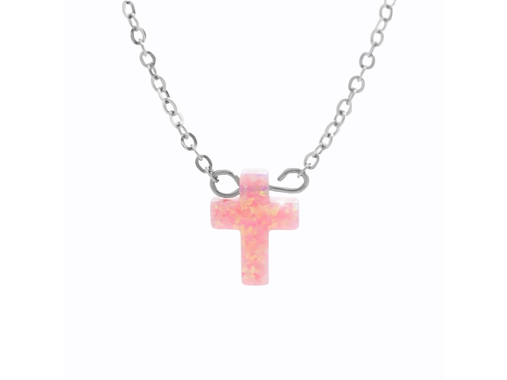 Ocelový náhrdelník s přívěskem kříže ze syntetického růžového opálu