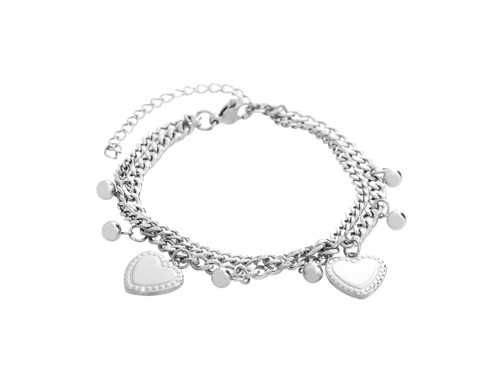 Ocelový náramek dva spojené řetízky doplněné o srdíčka a kuličky bez krystalů