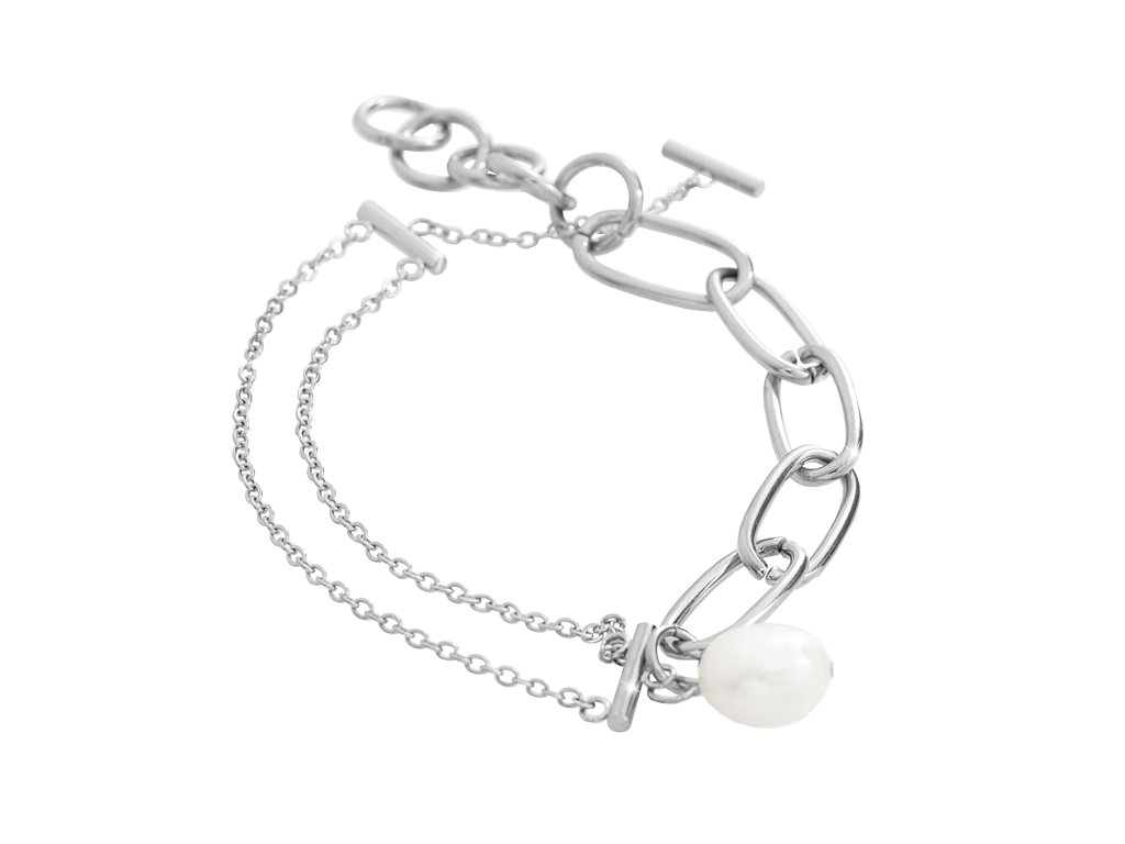 Ocelový náramek jeden řetěz a dva řetízky doplněný o perlu White