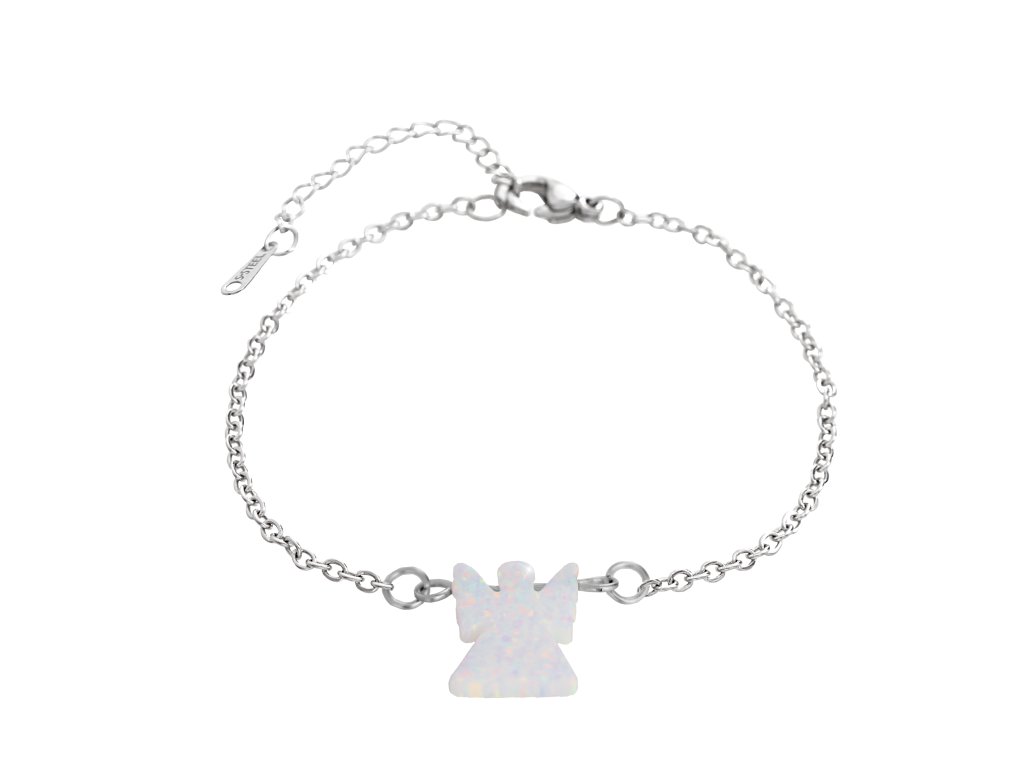 Ocelový náramek s přívěskem anděla ze syntetického bílého opálu