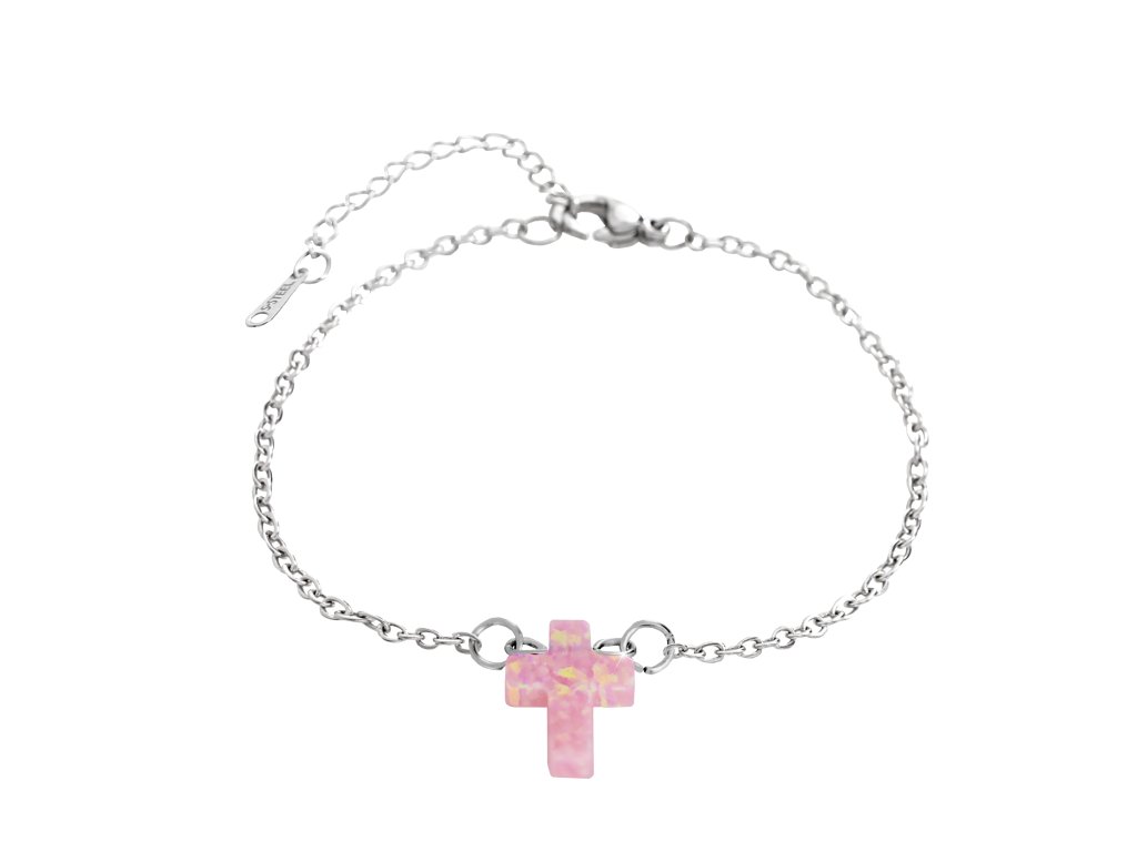Ocelový náramek s přívěskem kříže ze syntetického růžového opálu