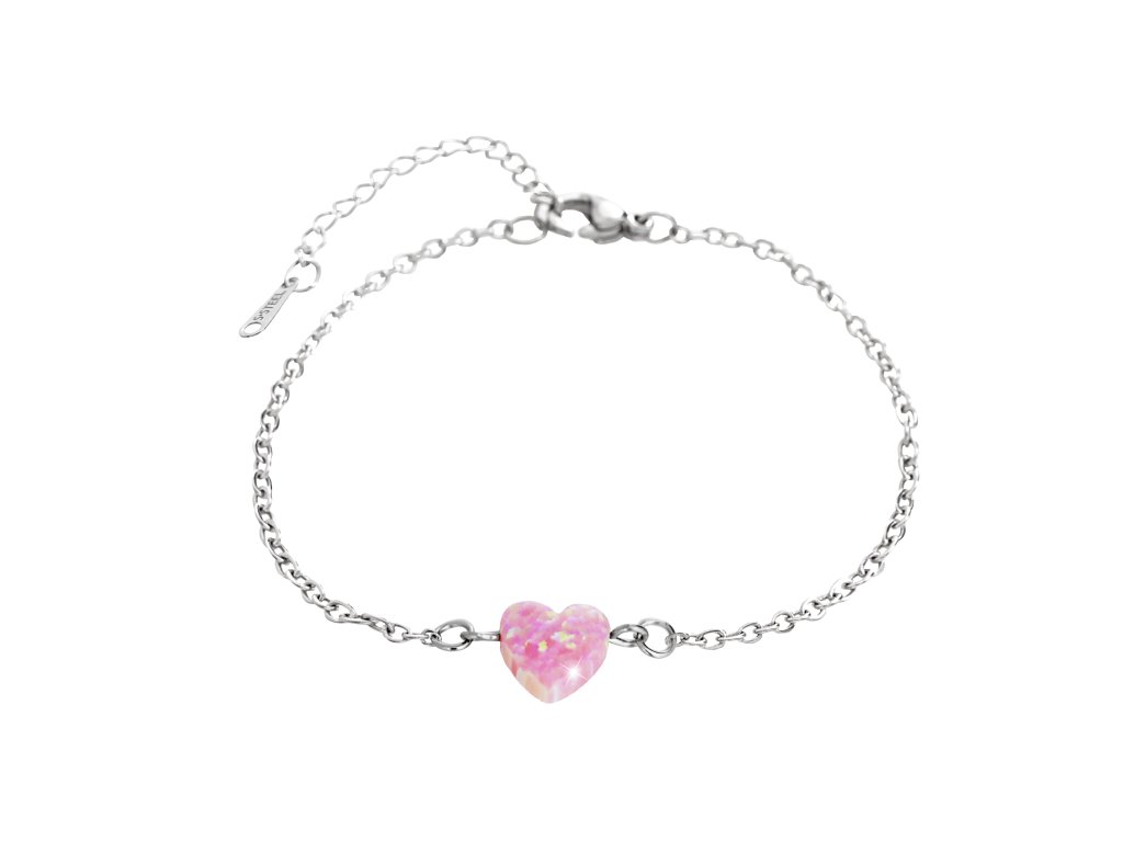 Ocelový náramek s přívěskem srdce ze syntetického růžového opálu