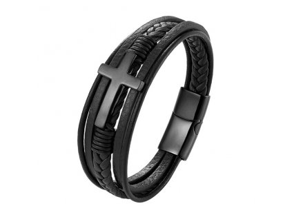 Pánský kožený náramek hnědý vícevrstvý chirurgická ocel Stříbrný kříž