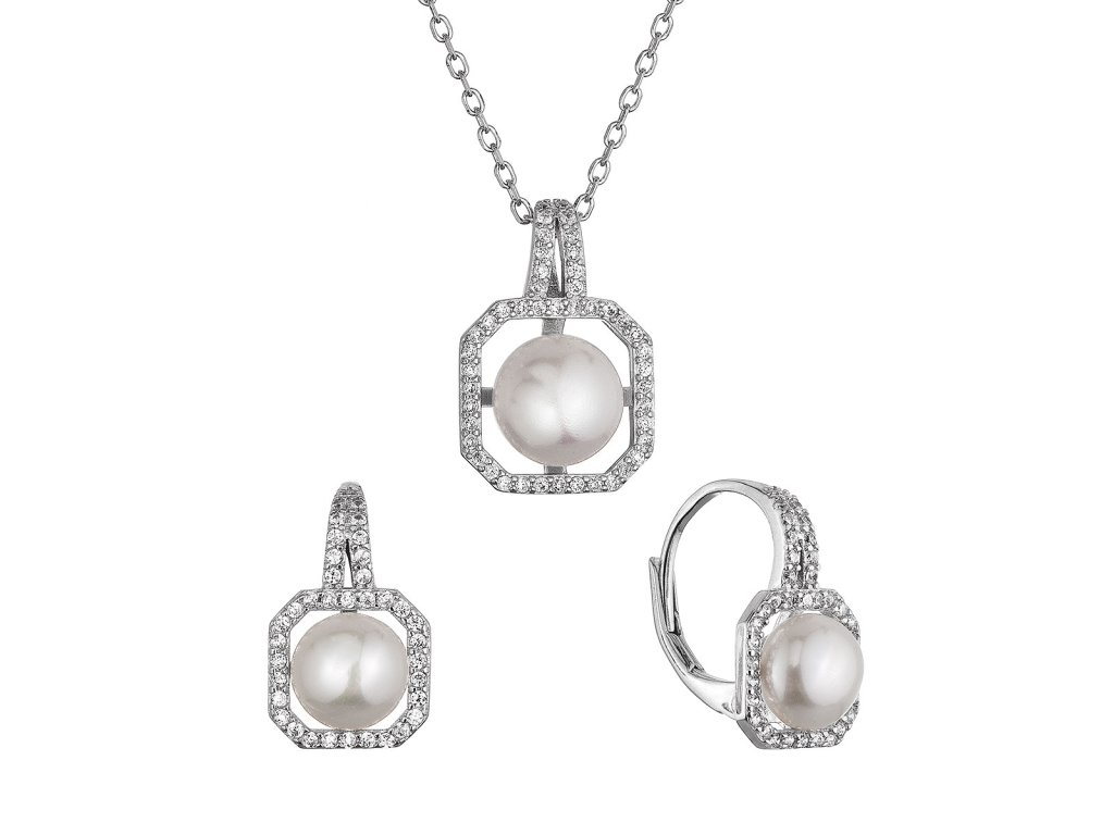 Perlová souprava s bílou říční perlou a zirkony čtverec 29083.1