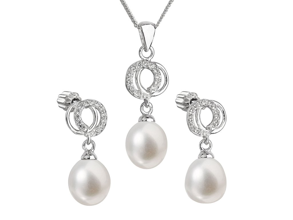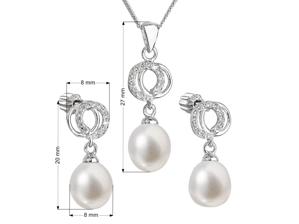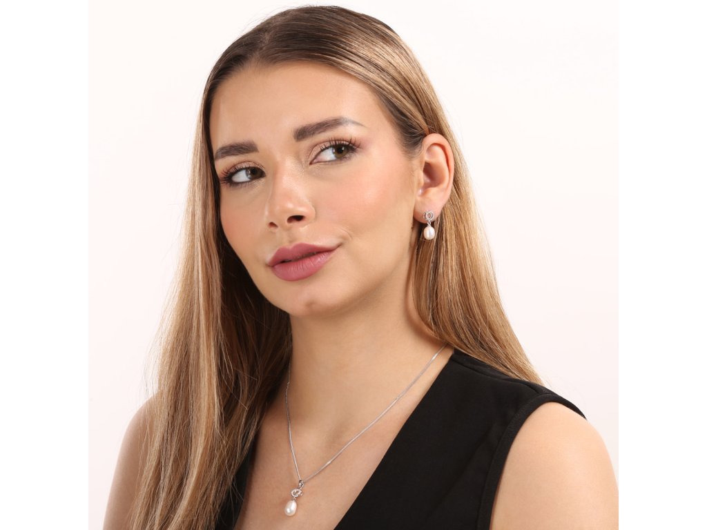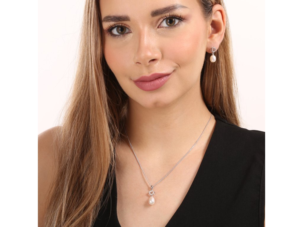 Souprava šperků se skládá z unikátních visacích náušnic s oválnou perlou a stříbrného řetízku s perlovým přívěškem. Šperky jsou zdobeny perlami spadající do kategorie nejvyšší kvality AAA a několika malými blýskavými zirkony. Stříbro, které jsme pro výrobu šperků použili, má ryzost 925/1000 a prošlo povrchovou úpravou rhodiem. Soupravu si mohou pořídit i alergici, šperky totiž neobsahují žádný nikl. Náušnice zapnete na klapku.