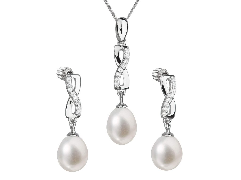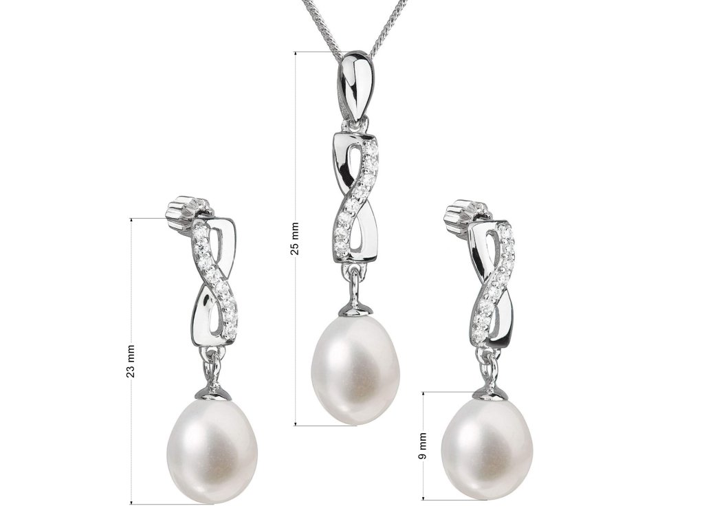 Souprava šperků se skládá z visacích náušnic s oválnou říční perlou a náhrdelníkem s perlovým přívěškem. Stříbrné šperky o ryzosti 925/1000 mají povrchovou úpravu rhodiem a perly, kterými jsou doplněny, spadají do kategorie kvality AA. Ta se může pochlubit velmi vysokým leskem. Přívěšek i náušnice jsou osázeny 8 blýskavými zirkony, díky nimž se šperky nádherně třpytí. Náušnice se zapínají na balonek. Šperky ze soupravy 29041.1 neobsahují nikl, a tak jsou vhodné i pro alergiky.