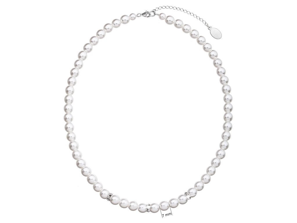 Perlový náhrdelník 32012.1 v délce 45 cm je složen z bílých perel, mezi něž jsou navléknuty tři rhuteniové rondelky osázené Swarovski krystalky. Krystaly jsou v bílé barvě. Na zapínání náhrdelníku bylo použito stříbro ryzosti 925/1000, které prošlo úpravou rhodiem. Rhodium stříbro ochrání proti zčernání, zežloutnutí i poškrábání. Náhrdelník je vhodný i pro alergiky, neobsahuje totiž nikl.