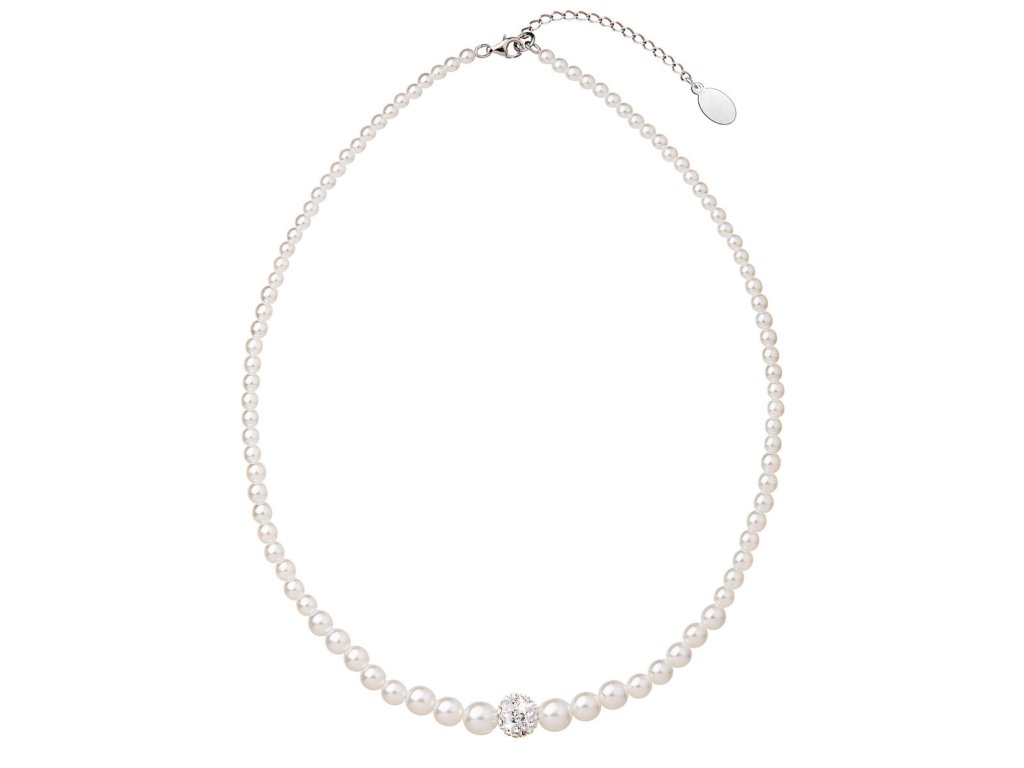 Perlový náhrdelník 32006.1 v délce 45+5 cm je složen z bílých syntetických perel a uprostřed je kulička osázená preciosa krystaly. Krystaly jsou v bílé barvě. Na zapínání náhrdelníku bylo použito stříbro ryzosti 925/1000, které prošlo úpravou rhodiem. Rhodium stříbro ochrání proti zčernání, zežloutnutí i poškrábání. Náhrdelník je vhodný i pro alergiky, neobsahuje totiž nikl.