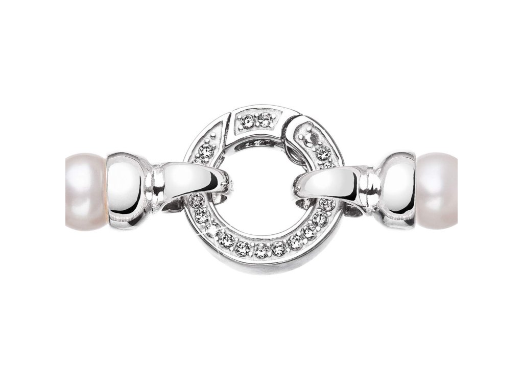 Perlový náhrdelník 22036.1 z bílých říčních perel o délce 45 cm vnitřního návleku a 48 cm délka druhé řady. Každá perla je zajištěna uzlíkovou vazbou, a tak se při nechtěném přetržení náhrdelníku nestane, že se vám perly rozkutálí na všechny strany. Zajímavě řešené kulaté stříbrné zapínání zdobené několika třpytivými zirkony dodává náhrdelníku na eleganci. Stříbro použité na zapínání má ryzost 925/1000 a rhodiovou povrchovou úpravu. Náhrdelník neobsahuje nikl, a tak ho mohou bez obav nosit i alergici.