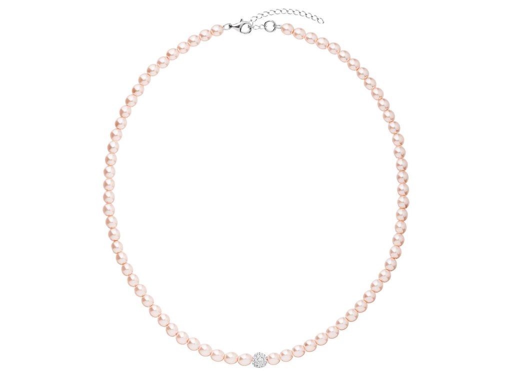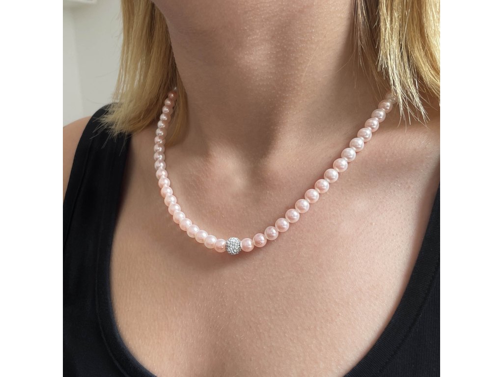 Perlový náhrdelník 32063.3 v délce 45+5 cm je poskládán z malých růžových perel, mezi něž je navléknuta kulička osázená mnoha Preciosa krystalky v bílé barvě. Na zapínání náhrdelníku bylo použito stříbro ryzosti 925/1000, které prošlo úpravou rhodiem. Rhodium stříbro ochrání proti zčernání, zežloutnutí i poškrábání. Náhrdelník je vhodný i pro alergiky, neobsahuje totiž nikl.