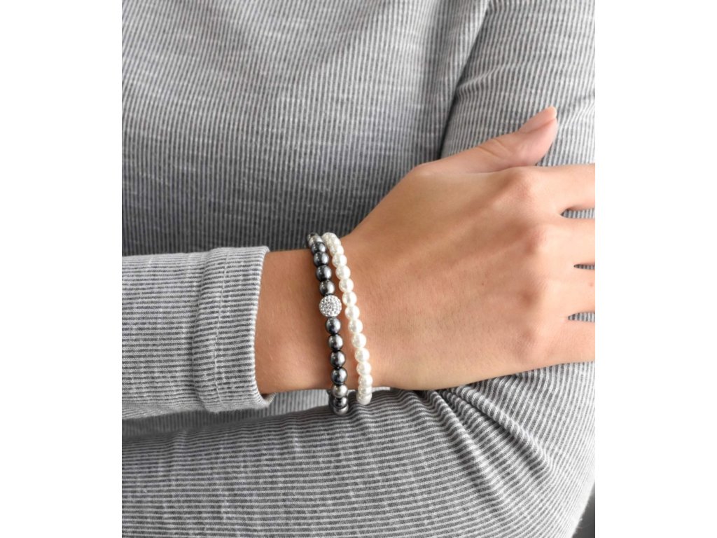Hned dva perlové náramky vám nabídne souprava 33106.3 - jeden bílý a druhý v šedé barvě zdobený Preciosa krystaly.Náramky jsou navlečeny z kulatých perel. Šedý náramek je doplněn o stříbrnou kuličku bohatě osázenou bílými Preciosa krystaly. Náramky se vzájemně skvěle doplňují, avšak můžete je nosit i zvlášť, záleží jen na vás.