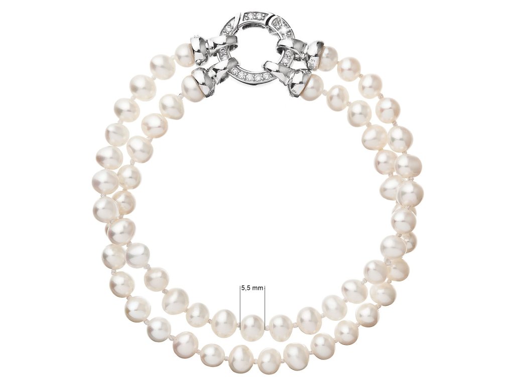 Chystáte se na slavnostní událost? Doplňte svůj outfit o luxusní dvouřadý perlový náramek 23013.1 z pravých říčních perel. Pro svou eleganci jej však nemusíte využívat jen pro sváteční událost.Perlový dvouřadý náramek o délce 19,5 cm je z oválných říčních perel velikosti 5,5 - 6 mm v bílé barvě. Každá perla je zajištěna uzlíkovou vazbou, a tak se při nechtěném přetržení náramku nestane, že se vám perly rozkutálí na všechny strany. Zajímavě řešené kulaté stříbrné zapínání zdobené několika třpytivými zirkony dodává náramku na eleganci. Stříbro použité na zapínání má ryzost 925/1000 a rhodiovou povrchovou úpravu. Náramek neobsahuje nikl, a tak ho mohou bez obav nosit i alergici.