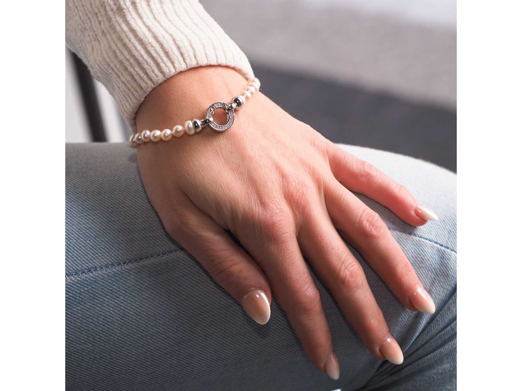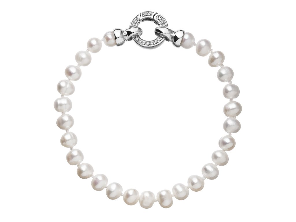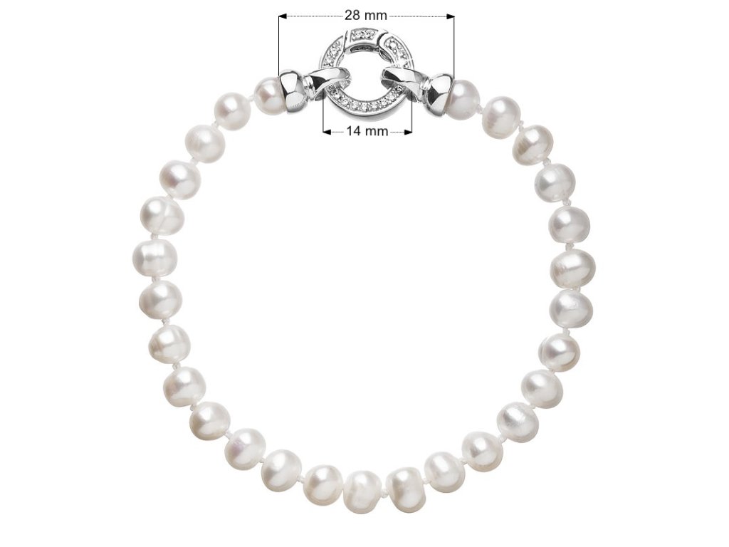 Perlový náramek o délce 19,5 cm je složen z oválných říčních perel velikosti 5,5 - 6 mm kvality B v bílé barvě. Každá perla je zajištěna uzlíkovou vazbou, a tak se při nechtěném přetržení náramku nestane, že se vám perly rozkutálí na všechny strany. Zajímavě řešené kulaté stříbrné zapínání zdobené několika třpytivými zirkony dodává náramku na eleganci. Stříbro použité na zapínání má ryzost 925/1000 a rhodiovou povrchovou úpravu. Náramek neobsahuje nikl, a tak ho mohou bez obav nosit i alergici.