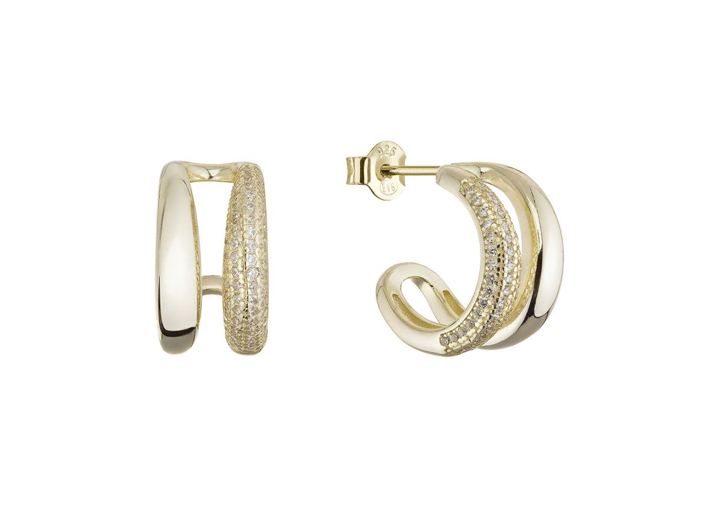 Pozlacené náušnice s dvojitými kruhy nabízejí elegantní design, který kombinuje hladkou a zirkony osázenou část. Tento kontrast vytváří harmonii mezi jednoduchostí a luxusem.