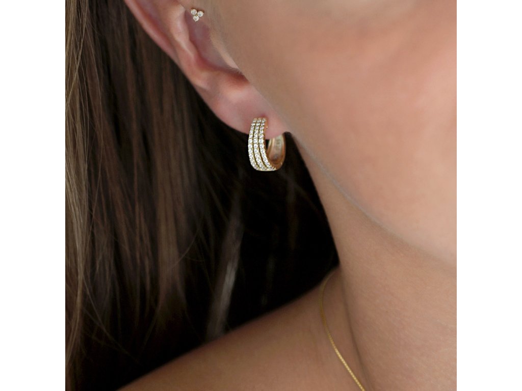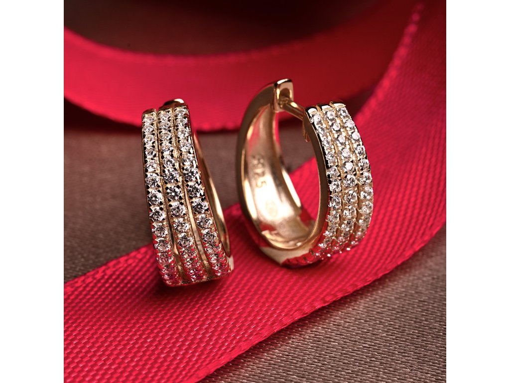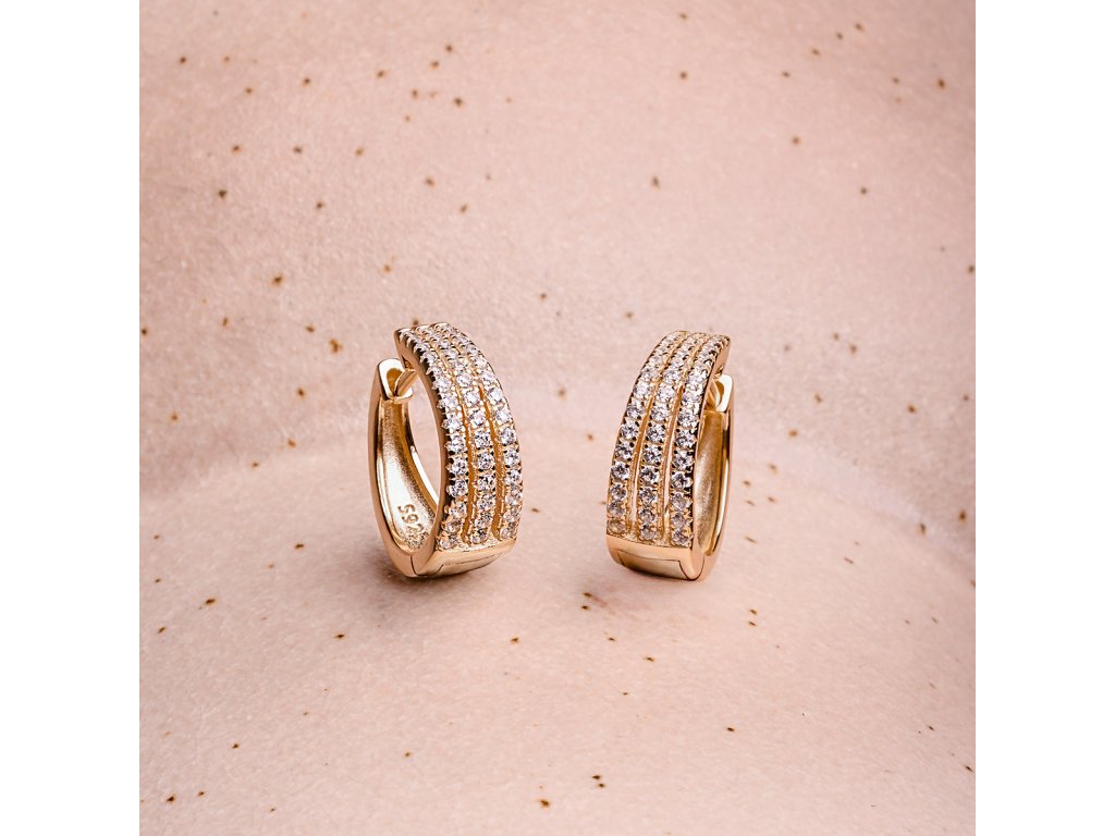 Náušnice jsou vyrobeny ze stříbra ryzosti 925/1000, jehož povrch je jemně pozlacen. Tři řady zářivých čirých zirkonů jim dodávají luxusní vzhled a jemný třpyt při každém pohybu. Praktické zapínání na ruský patent zajišťuje pohodlné a bezpečné nošení.