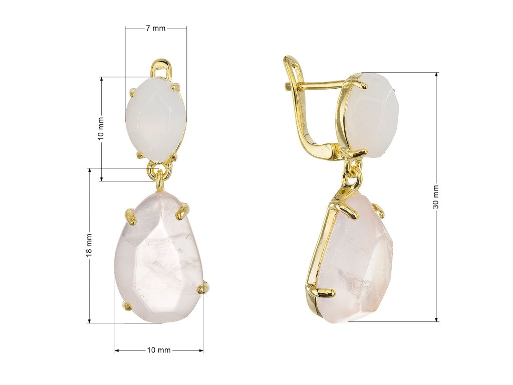 Náušnice jsou vyrobeny z pozlaceného stříbra nejvyšší kvality ryzosti 925/1000. Šperk zdobí dva vzácné kameny v nádherném, téměř sochařském provedení - větší, něžně růžový růženín a menší, jemně modrošedý chalcedon. Jejich vertikální uspořádání vytváří dynamickou kompozici plnou kontrastu a harmonie. Pozlacený povrch dodává náušnicím teplý, jemný lesk, který dokonale rozzařuje krásu kamenů. Pohodlné zapínání na ruský patent zaručuje spolehlivé a bezpečné nošení.