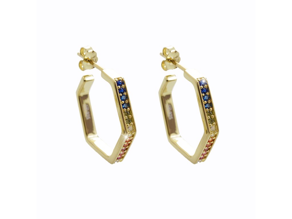 Pozlacené stříbrné náušnice hranaté kreole s barevnými Kubickými zirkony Multi (Stříbro 925/1000)