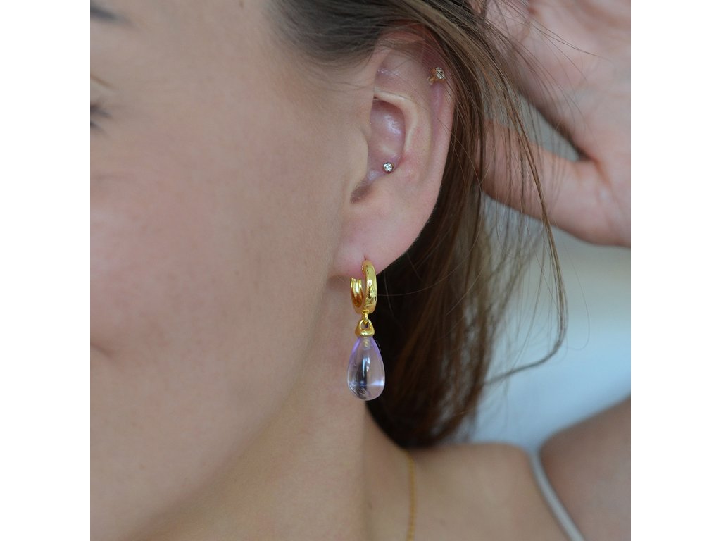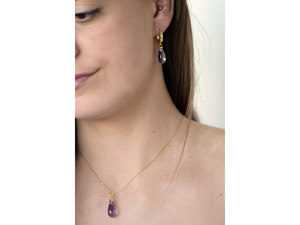 Náušnice jsou vyrobeny ze stříbra ryzosti 925/1000 s jemným pozlaceným povrchem, který dodává šperku luxusní a teplý lesk. Jejich jedinečný design kombinuje jemnost a dynamiku - pravý fialový ametyst ve tvaru něžné kapky se při každém pohybu lehce pohupuje, čímž vytváří elegantní a živý šperk. Zapínání na kroužek zajišťuje pohodlné a spolehlivé nošení.