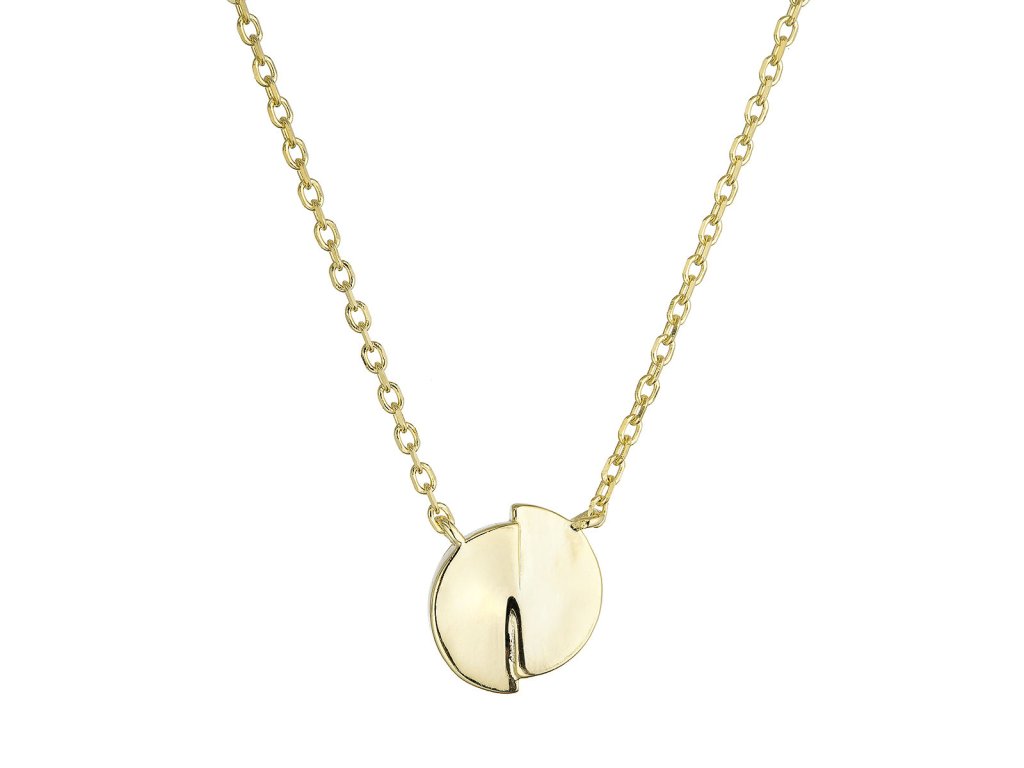 Pozlacený náhrdelník s rozpůlenou placičkou nabízí moderní a elegantní vzhled, který se hodí k jakémukoliv outfitu. Jemná linie uprostřed přívěsku dodává šperku originální vzhled.