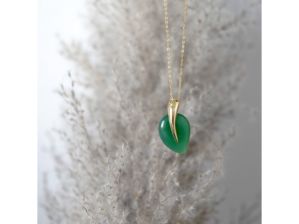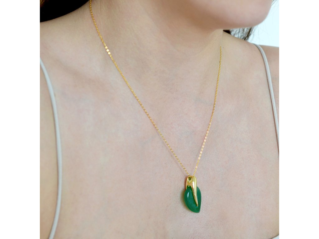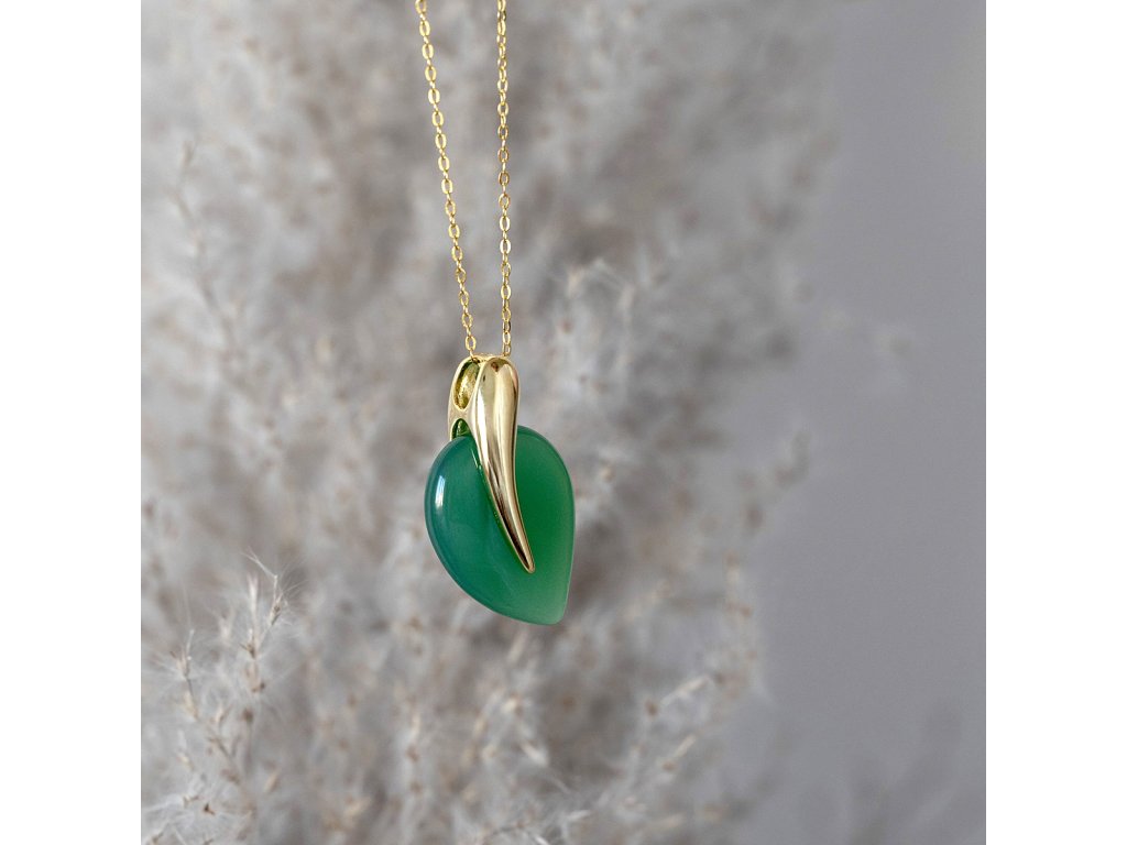 Náhrdelník s přívěskem je uměleckým dílem, které zachycuje křehkou poezii přírodního světa. Jemně pozlacené stříbro 925/1000 nese luxusní přívěsek ve tvaru dokonalého lístečku z pravého zeleného achátu. Uprostřed listu probíhá jemná pozlacená linie, která připomíná subtilní žilku a dodává šperku neopakovatelný rukopis přírody.