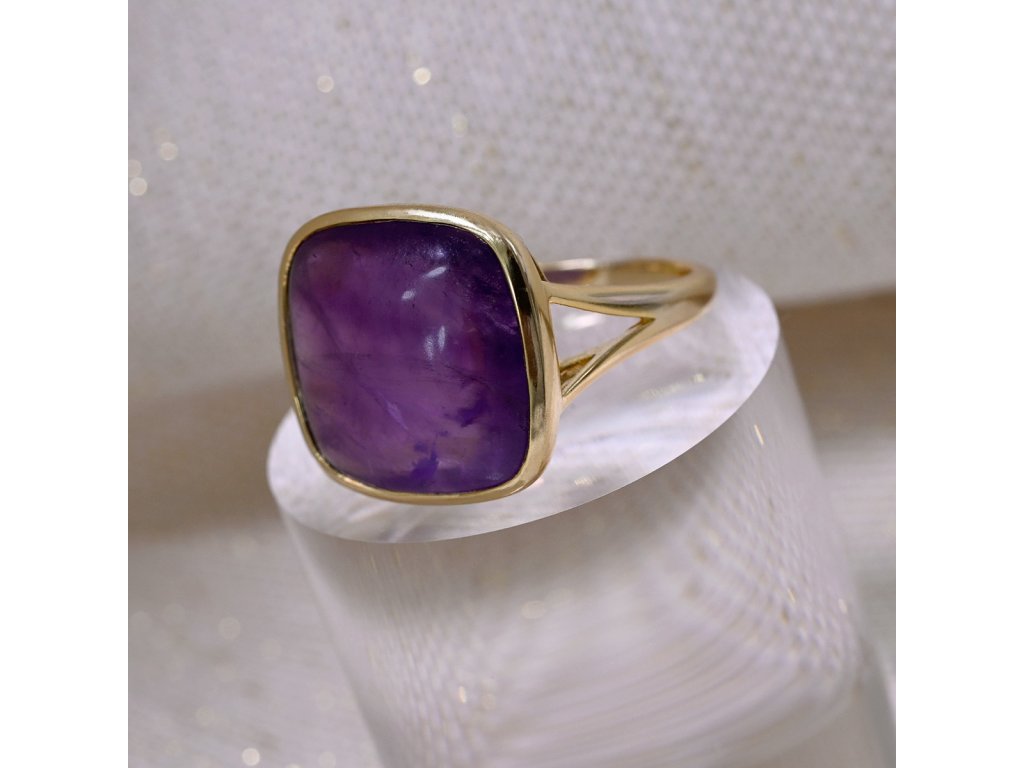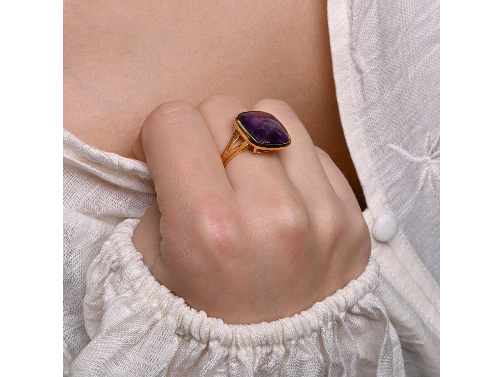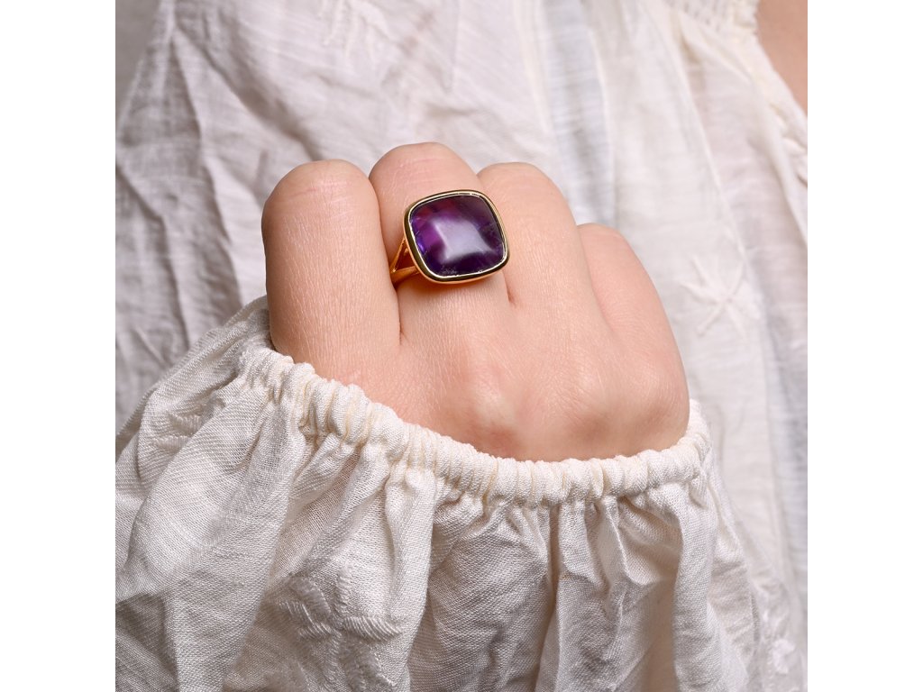 Prsten je vyroben z pozlaceného stříbra té nejvyšší kvality. Výrazný design čtvercového ametystu v hlubokých fialových tónech, který v sobě ukrývá energii klidu a vnitřní transformace ve zlaté obrubě. Pozlacená povrchová úprava stříbra dodává šperku teplý, elegantní tón.