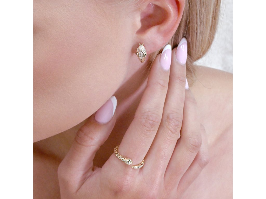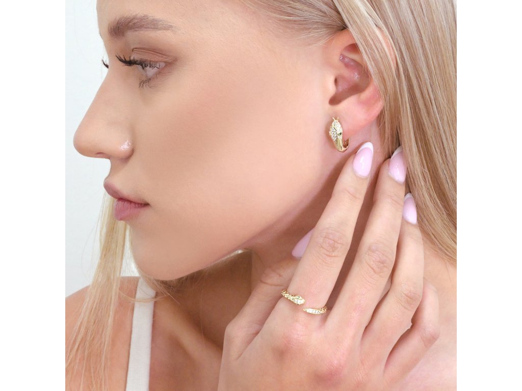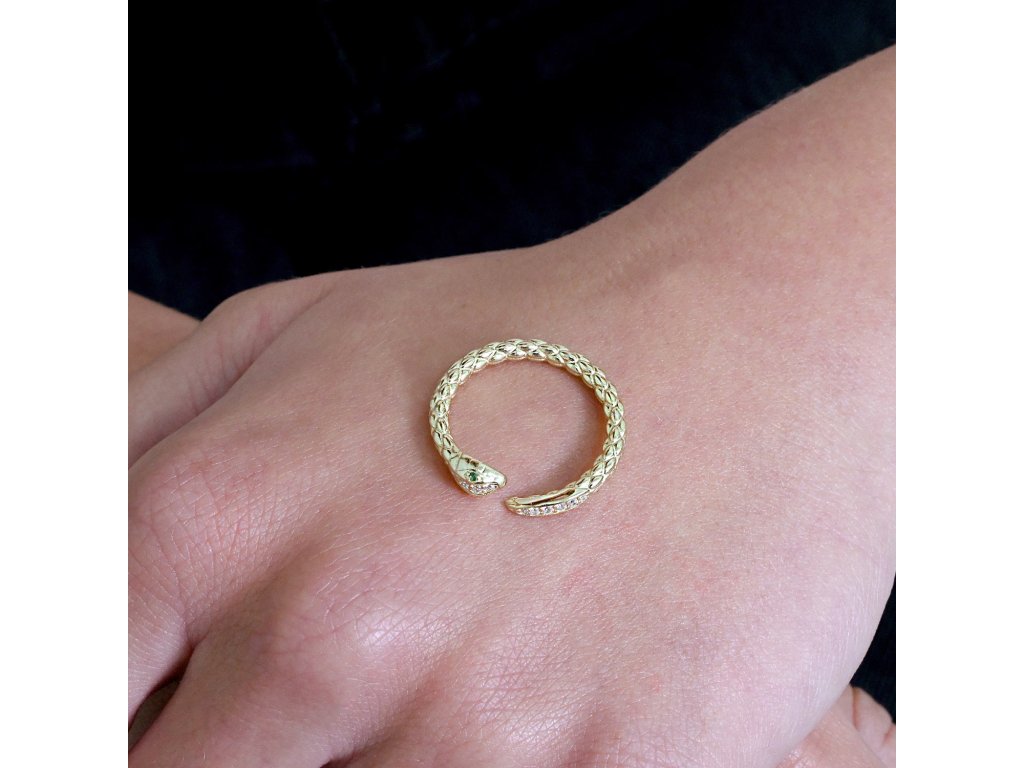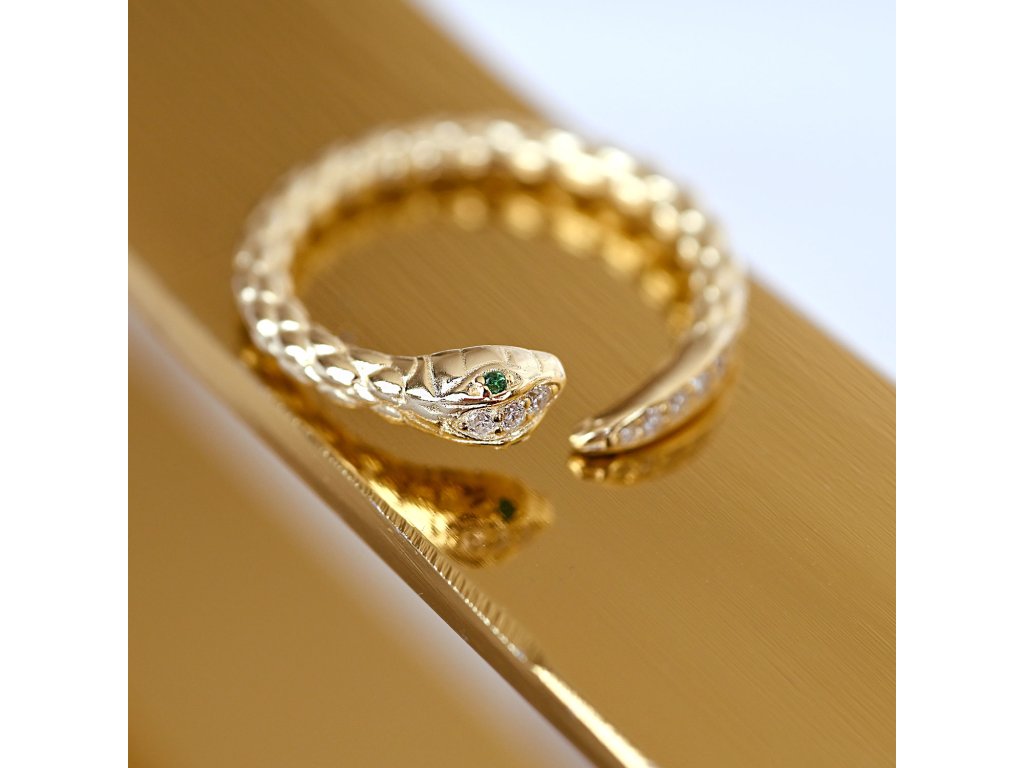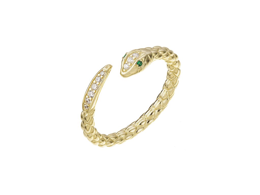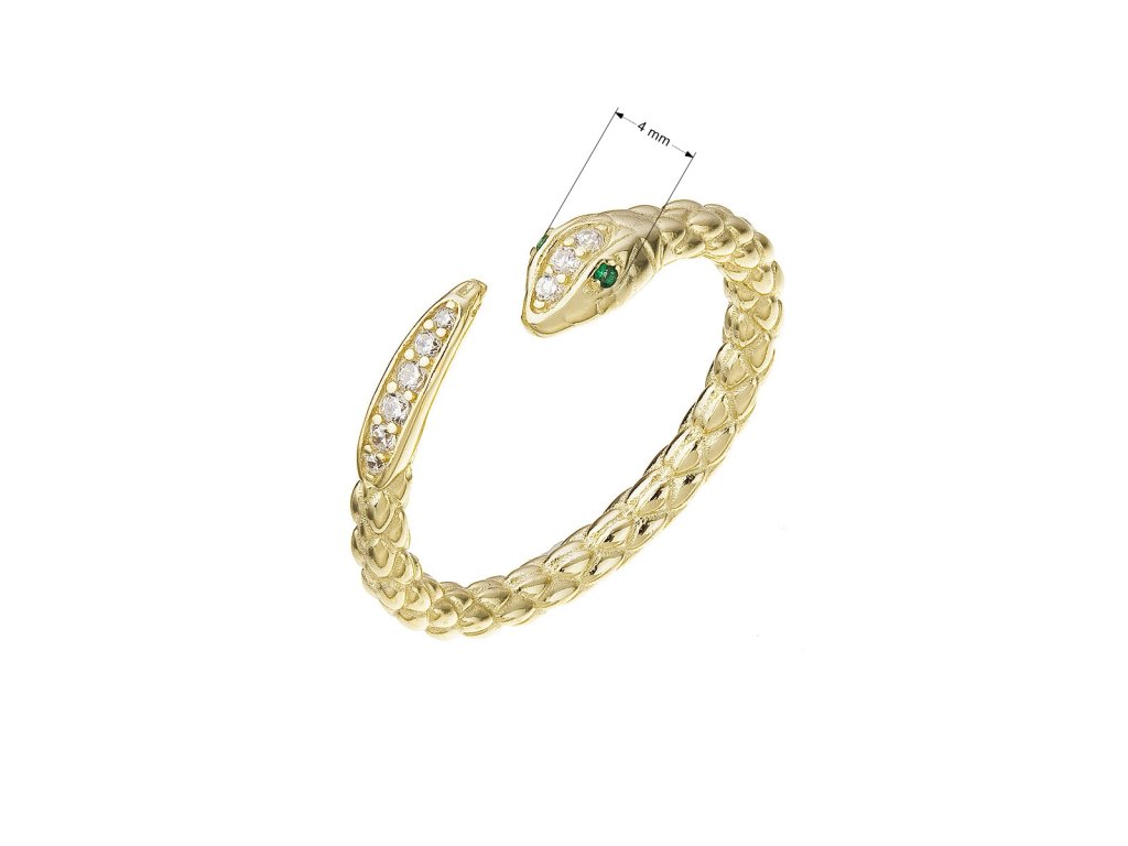 Tento oblíbený prsten, kterým je obtočený had kolem vašeho prstu je vyroben ze stříbra o ryzosti 925/1000 a je pozlacen. Na místě očí hada jsou vsazené zelené zirkonky.