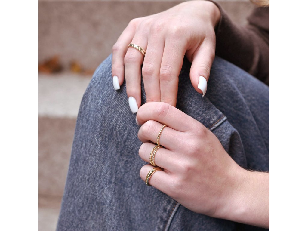 Jednoduchý design prstenu umožňuje snadné kombinování s jinými šperky. Můžete jej nosit samostatně nebo jako součást vrstveného vzhledu.