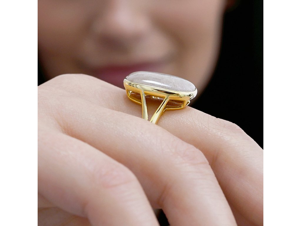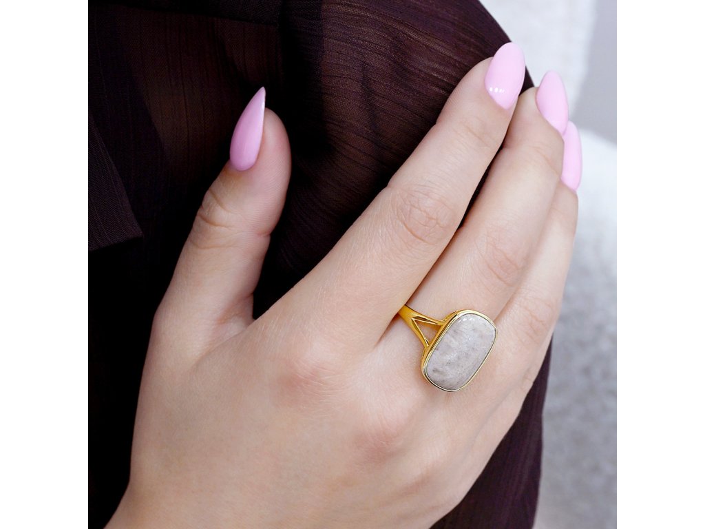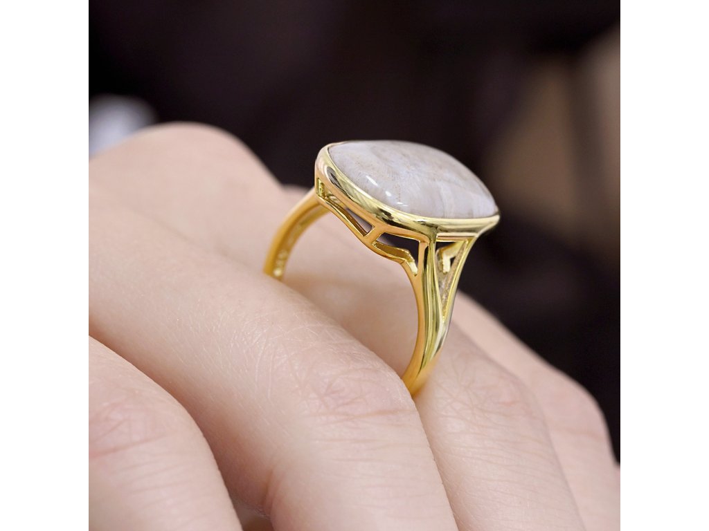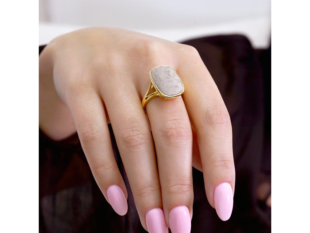 Prsten je vyroben z pozlaceného stříbra ryzosti 925/1000. Pozlacený povrch dodává šperku teplý, jemný lesk. Dominantní obdélník je vyplněn vzácným fosilním korálem v jemných hnědobéžových tónech, který v sobě uchovává tajemství pradávných oceánů. Každý kus tohoto šperku je unikátní - fosilní korál nese stopy času, připomínající křehkou krásu mořského světa před miliony let.