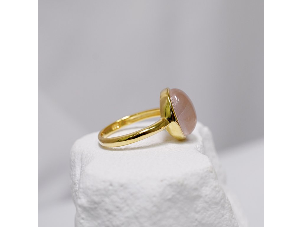 Prsten je uměleckým ztvárnění lásky a vnitřního klidu - něžný růženín v jemném pozlaceném oválu vytváří jedinečnou hru světla a stínu. Šperk je vyroben z ryzího stříbra 925/1000 s jemnou pozlacenou úpravou v teplých zlatých tónech. Pozlacený ovál v sobě ukrývá výjimečný růženín v něžných růžových odstínech, jejichž měkkost připomíná ranní úsvit.