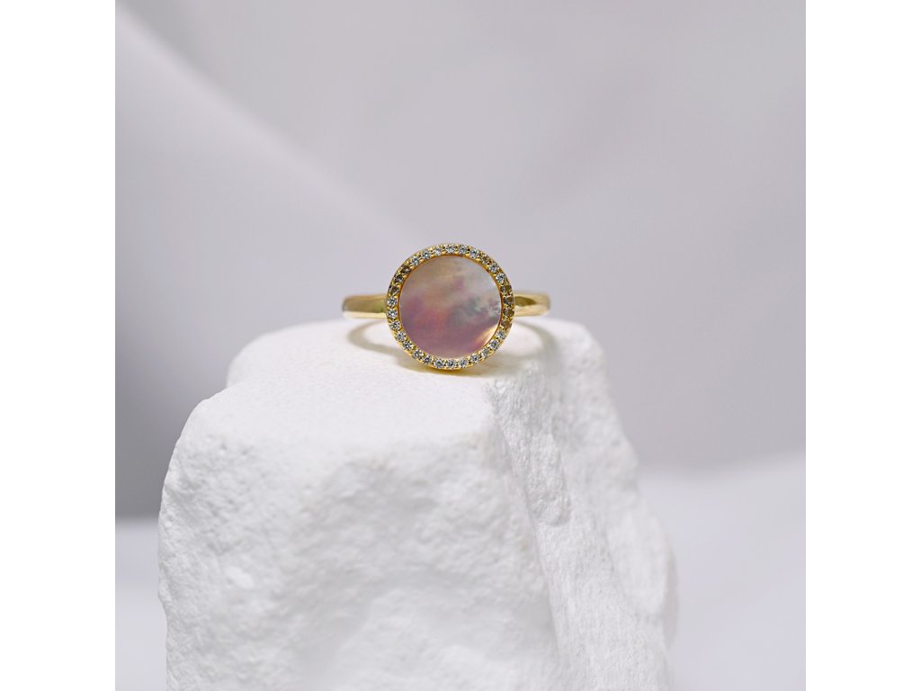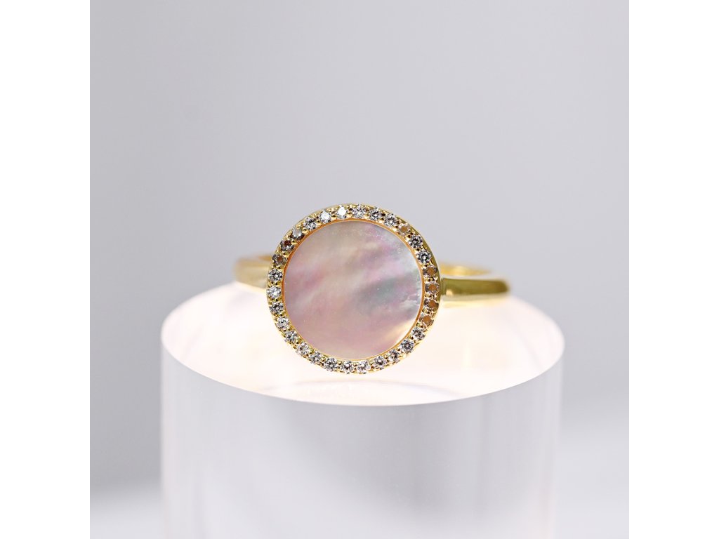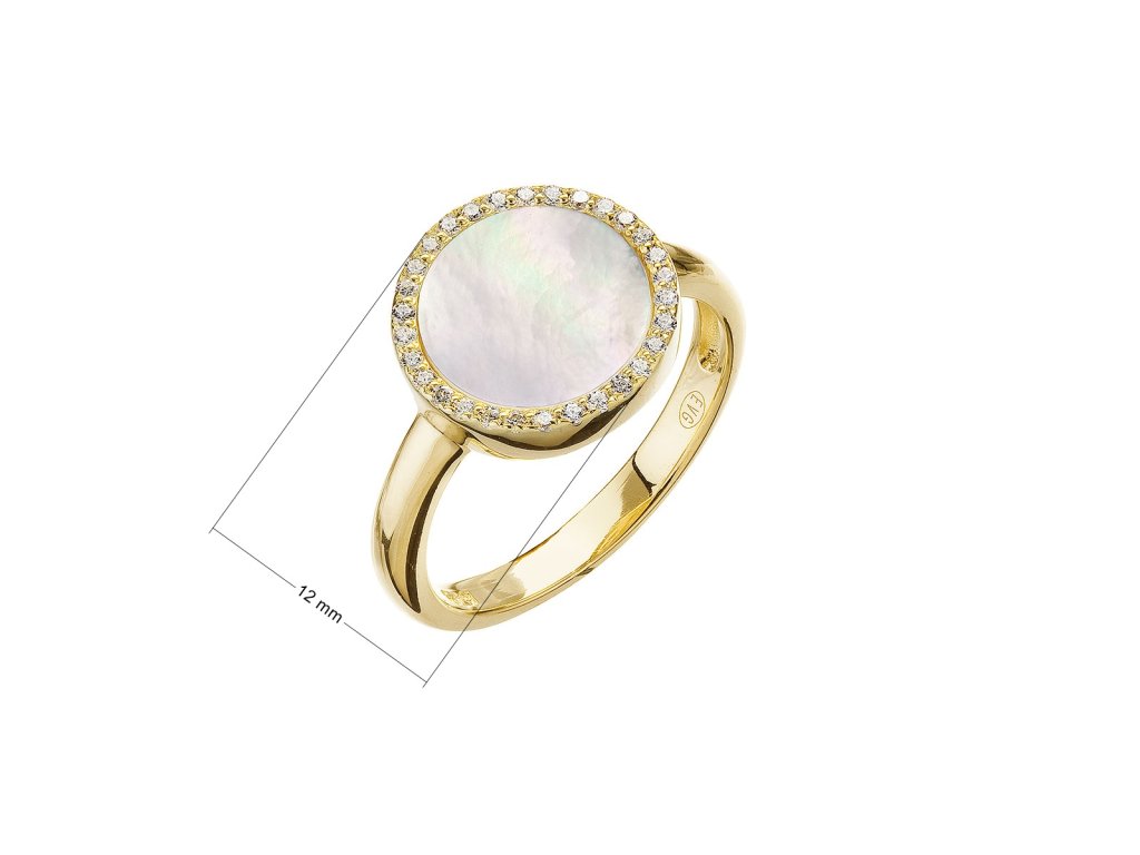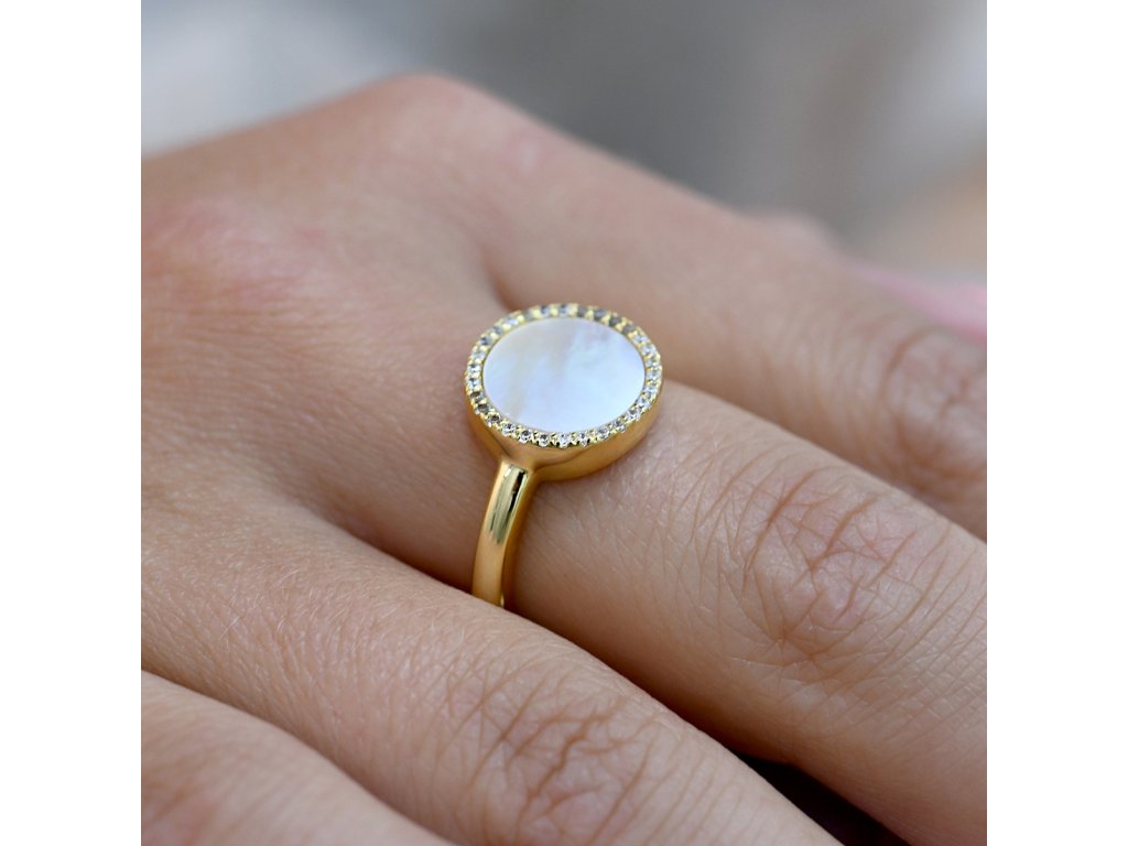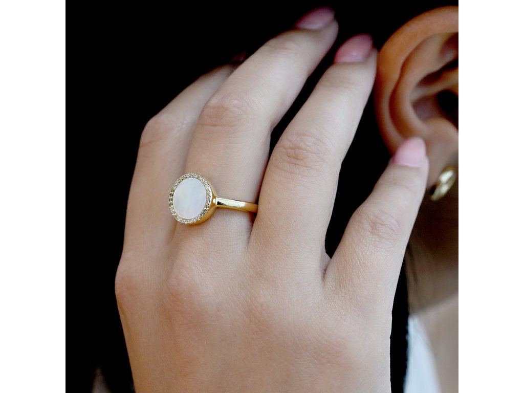 Elegantní prsten je vyroben ze stříbra ryzosti 925/1000 a pokryt vrstvou zlata, která mu dodává teplý lesk a luxusní vzhled. V jeho středu se třpytí přírodní bílá perleť – zářivý poklad mořského původu, známý svou neuchopitelnou krásou a něžným leskem.