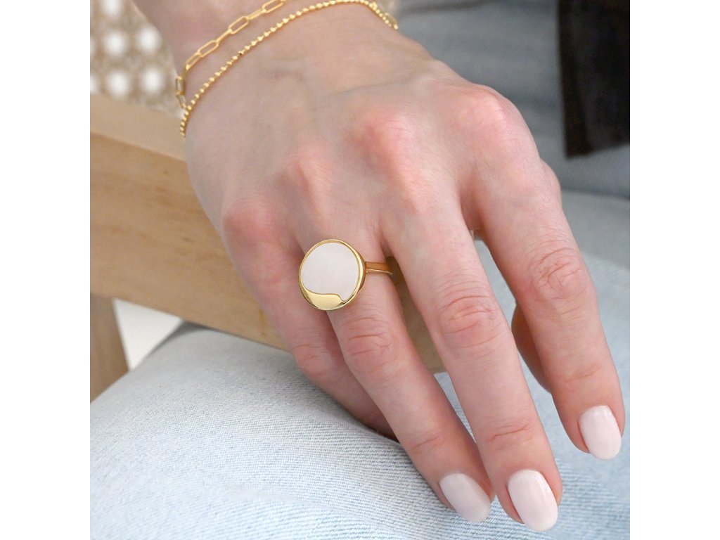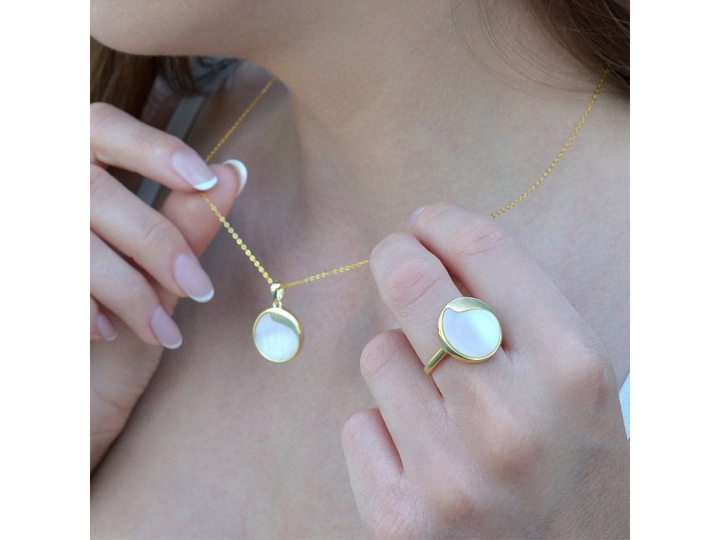 Prsten je vyroben z pozlaceného stříbra té nejvyšší kvality 925/1000. Pozlacený povrch dodává teplý, jemný lesk. Kolečko zdobené pravou růžovou perletí je decentně vykrojené, dodává šperku jedinečný charakter.